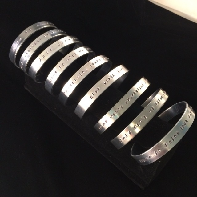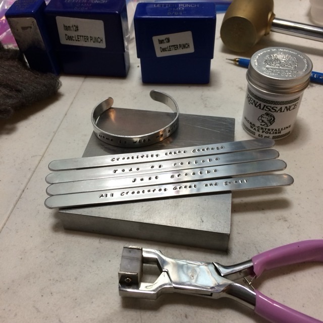 Photo description: bracelet stamping tools: steel wool, metal letter stamps, dead blow hammer, pencil, finishing wax, steel stamping block, aluminum bracelet blanks, forming pliersPhoto description: nine stamped aluminum bracelets laid out on black velvet