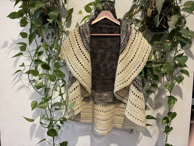 I crocheted several more rows onto LazyTCrochet’s circle vest pattern, past the “plus size” listed in the instructions. I followed the general feel of the pattern up to that point, and crocheted until I ran out of my hand-spun Teeswater yarn. It was still feeling small and tight.