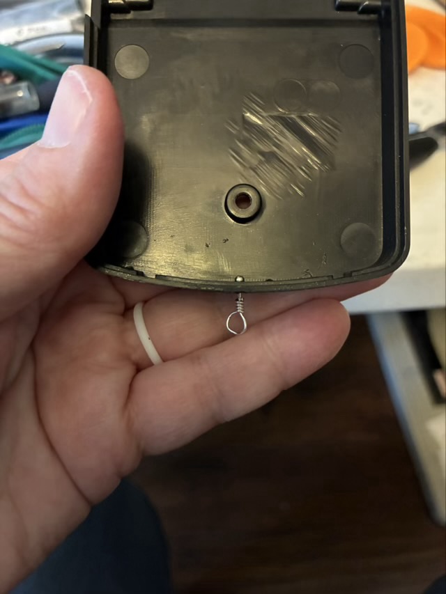 My Barbershop chorus has an electric pitch pipe that is quite versatile, and quite large. It doesn’t fit in a pocket very well and although it comes with a stand, it doesn’t have a way to carry it hands free. We did have a lanyard loop stuck on the back with double sided tape for a long time, but then the tape gave out and the pitch pipe fell to the floor. So I came up with a mechanical connection.