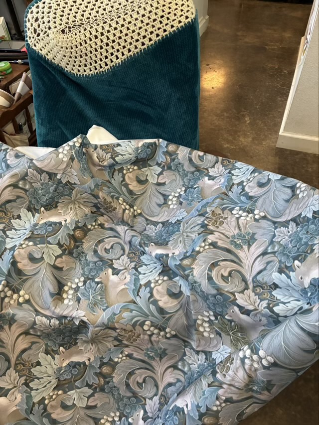 I do like the Art Nouveau look with squirrels on the fabric. Izzy has already started to reclaim the new cover. It’s a good thing I like cats more than furniture.