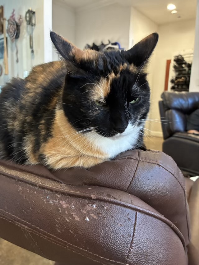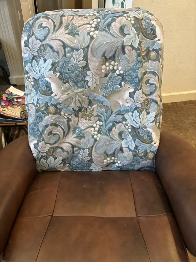 Izzy the cat was quite miffed when I got a new chair and got rid of the hollow she has been carefully cultivating for years. She started the process over with the new chair and decided to add in claw sharpening, much to my dismay. To hide the damage I made a chair back cover with materials from around the house. It worked OK, but kept sliding, so I bought some nice heavy custom-print fabric from Spoonflower to make a new cover.