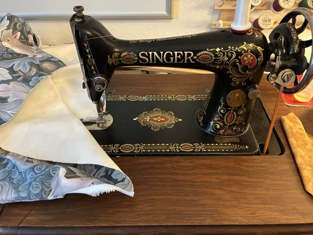 The first decision I had to make was how to construct the back cover. I decided to do a long strip up the sides and top, and a panel for the front and back. I tore the fabric to get straight lines (yes, light denim will tear like cotton plain weave, just make sure to tear at least an inch away from the seam line because the threads distort at the tear.) I then used the treadle sewing machine to sew up a new cover. I did a fit once the side seams were done, adjusted the length, then sewed a hem.