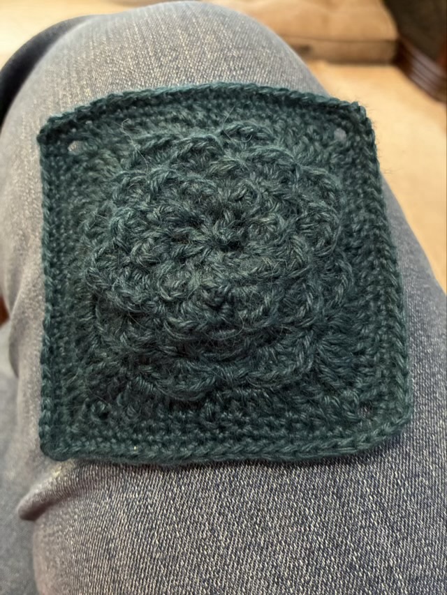 The photos of these squares are all taken fresh off the hook, before blocking, so they aren’t yet square. Also, teal is a difficult color to photograph, so none of the photos are true to actual color. Hm.