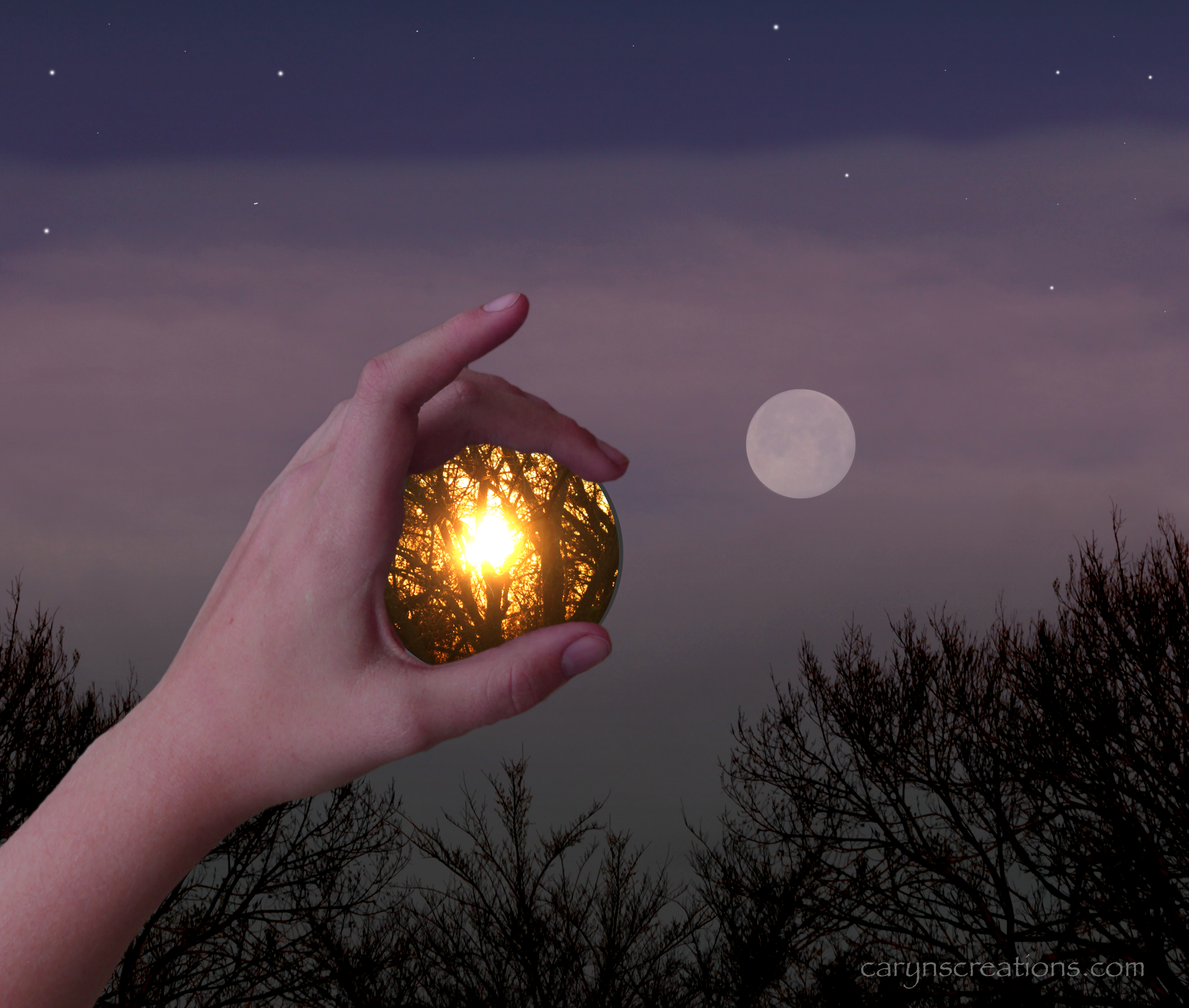Last week there was a beautiful moon near the horizon and a stunning sunrise, in opposite directions. I couldn’t photograph them in the same shot. I thought that if I had a mirror, I might be able to capture both with some experimentation with angles, but alas, I had no mirror and the minimal focal distance of my lens is longer than my arm. So I put a composite image together in Photoshop. I think it came out nicely, and it was certainly fun to experiment!
