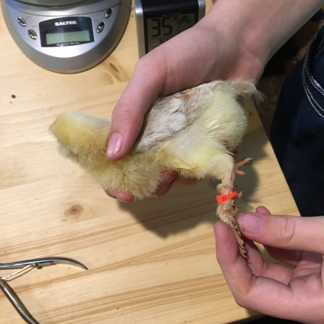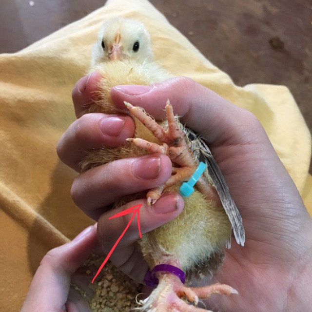 The chicks are really growing! Today we inspected everyone’s colored bands and replaced those that were getting small.