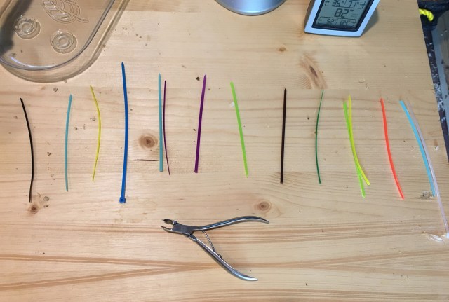 All but three bands needed changing out. The chicks escaped the barrier we put in the brooder, so we laid out the cut ends of the zip ties to see who else needed checking.