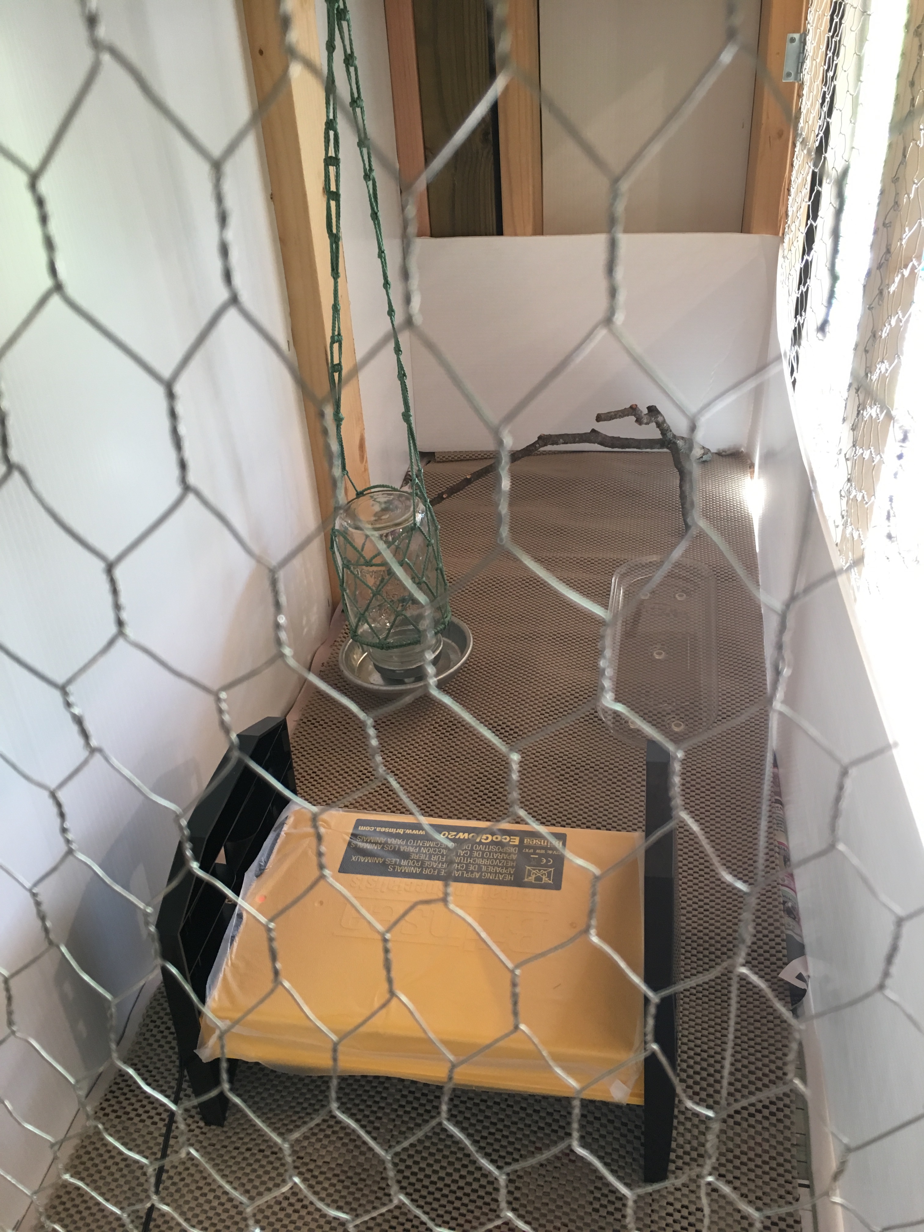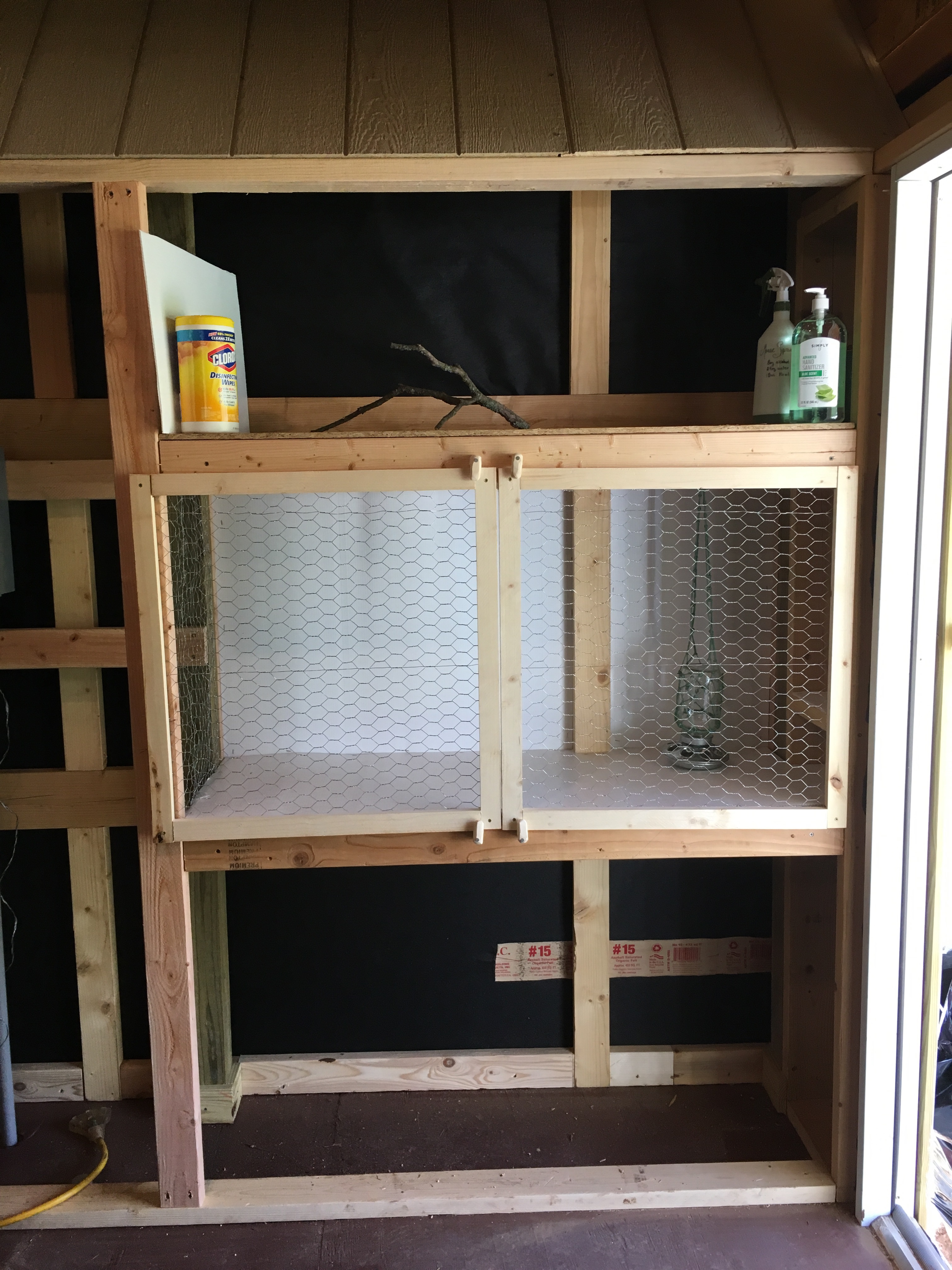 The brooder area is about at counter height, to make it easier to access and to not freak out the chicks by swooping down from above. There is still lots of storage space above and below (doors will come later, but before the chicks have free run of the coop.)