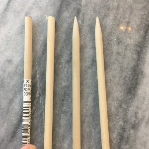 To make these needles I picked up 3/8″ poplar dowels, which are about 68 cents each, at my local hardware store. I also used 120 and 320 grit sand paper. I cut the dowels to 14.5″ (I used a chop saw, but a hand saw would also work). You can use the 120 grit sandpaper to sharpen one end of the dowel. Make a slightly more slanted angle than a sharpened pencil. Blunt the end slightly, so that it is still easy to pick up a stitch, but is harder to split the yarn.