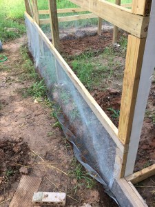We are using 1/4″ hardware cloth along the bottom to keep smaller critters out, but along the upper sides and top we are using larger fencing because of cost.