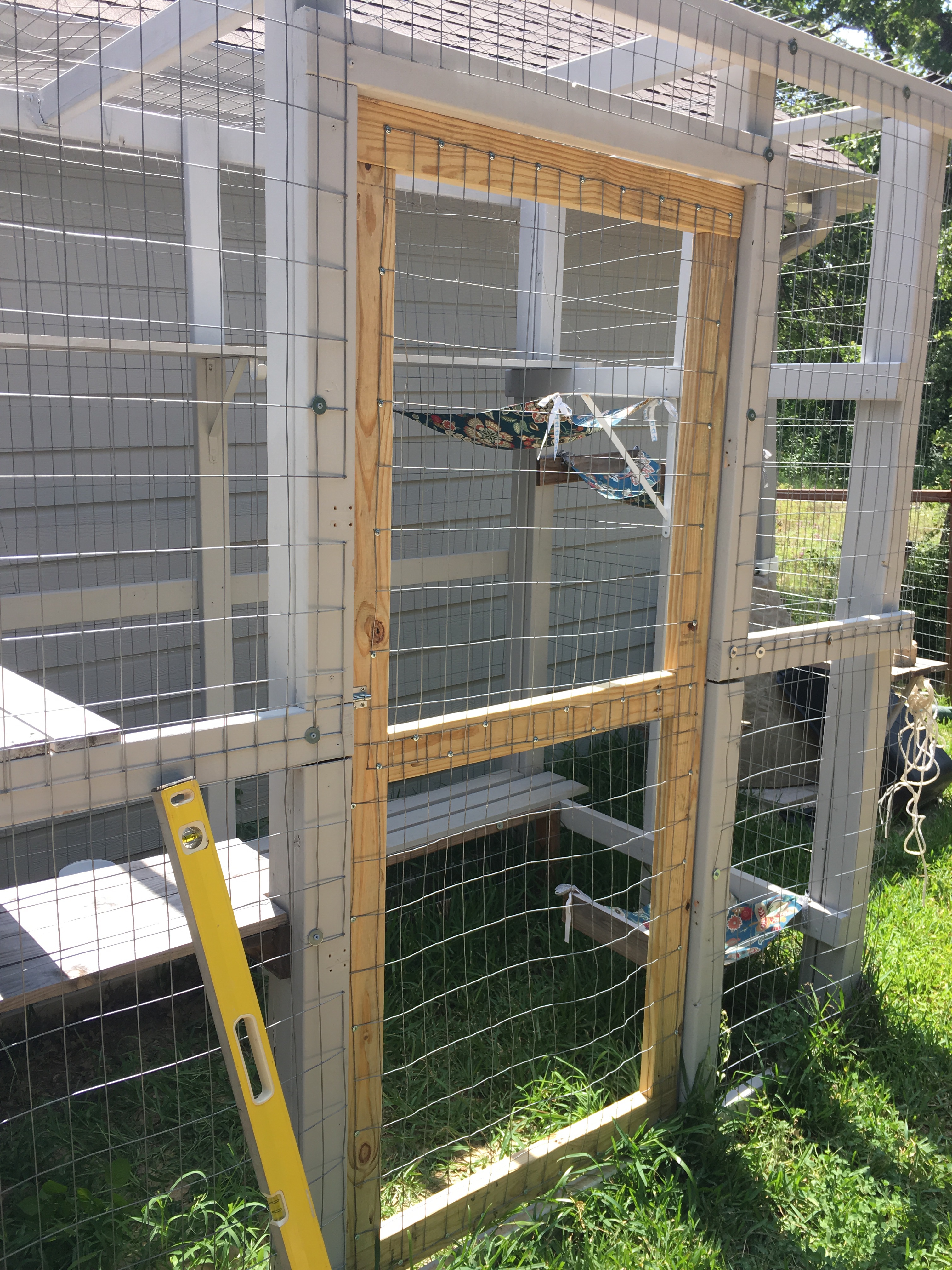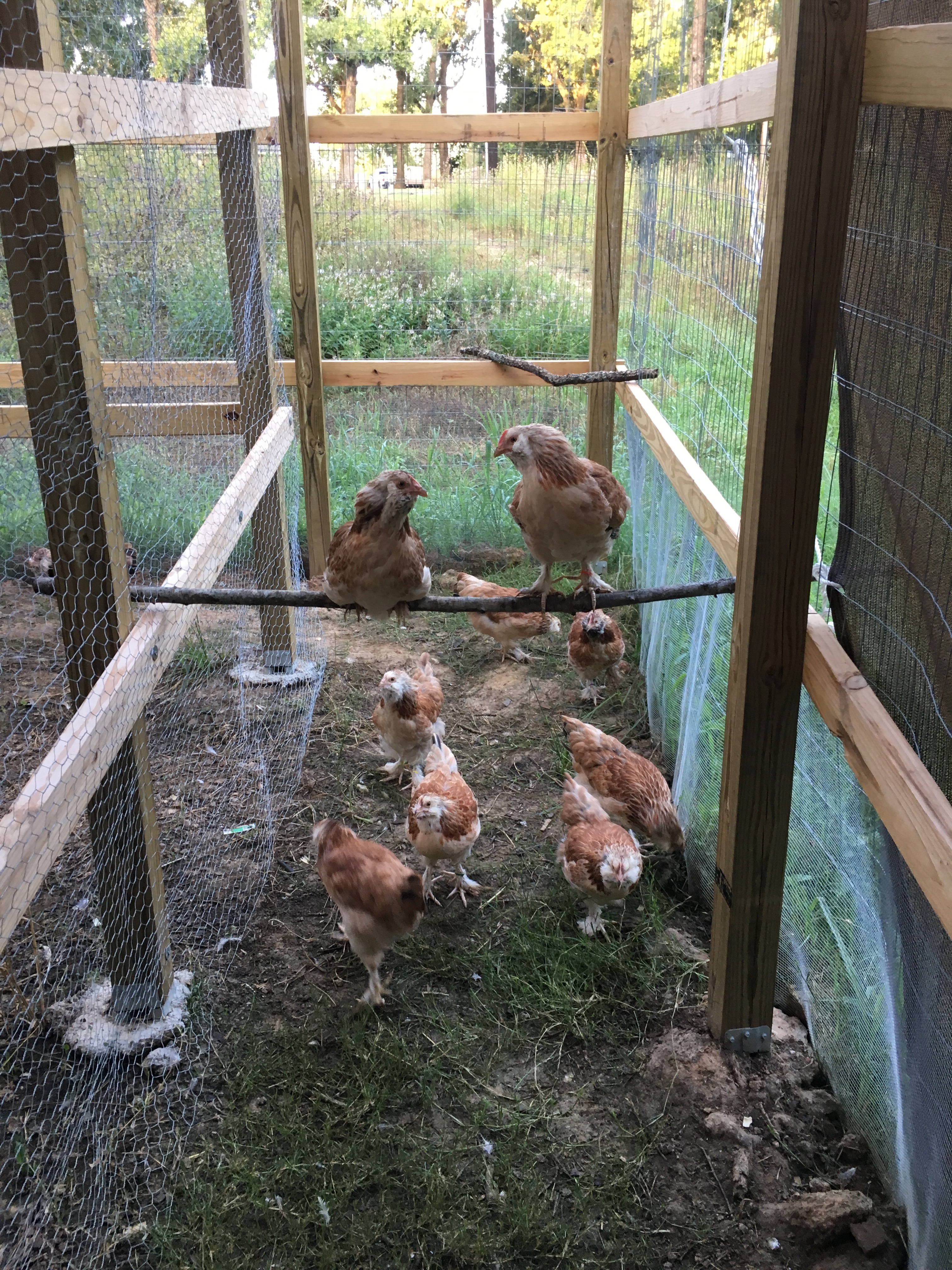 When we opened the third run, I put long sticks through the wire (no swings in this run). The chickens approve!