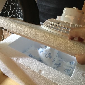 I could definitely feel the cool air when I turned on the fan! I started with the cooler in the enclosed section of the work table in the coop, so the chickens couldn’t pick at the styrofoam, but felt like the cool didn’t reach the chickens. So I put the the cooler in a plastic storage bin (it fit! Phew!), which has a fold down, two-part lid.