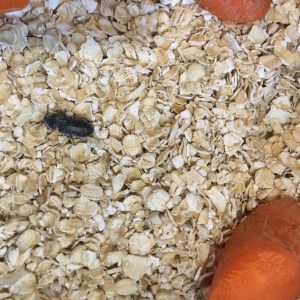 Some of the mealworm pupa have emerged as adult darkling beetles, which means we are well on our way to having our own mealworm farm.