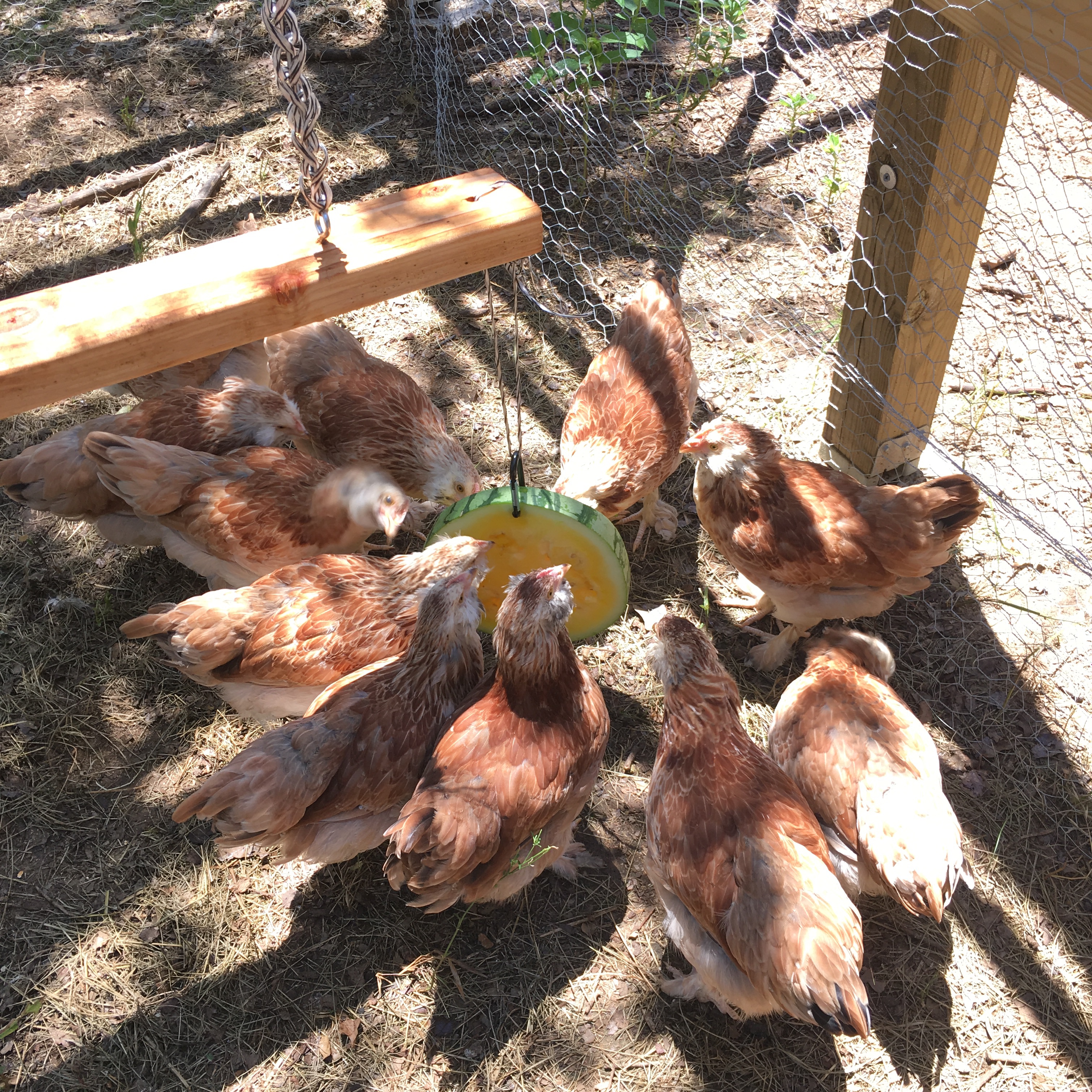 I know the chickens love anything on a paper plate, but after they devoured not only the slice of water melon, but half the paper plate as well, I decided it was better to just hang the watermelon. It keeps it off the ground, so away from the ants and chicken droppings, and they aren’t filling up on paper.