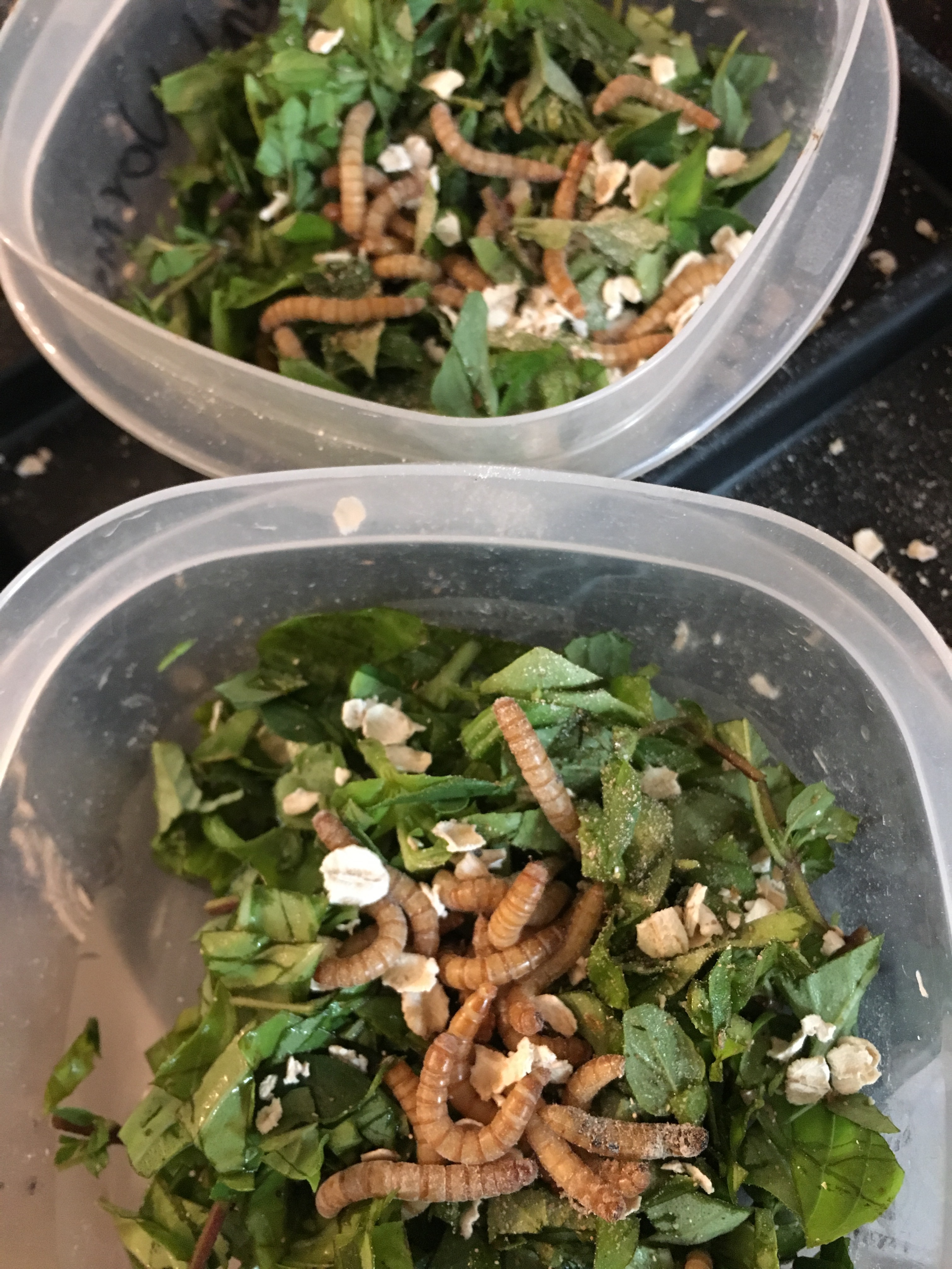 For the chickens. I know meal worms are high in protein, but I don’t personally want my salad to wriggle. The chickens loved it though! I chopped basil and oregano, then sprinkled the live meal worms on top. I used a strainer to get them out of the drawer, so some of the oatmeal came with them, which actually adds a nice touch to the look of the treat. Not that the chickens care about presentation as long as it is fast.