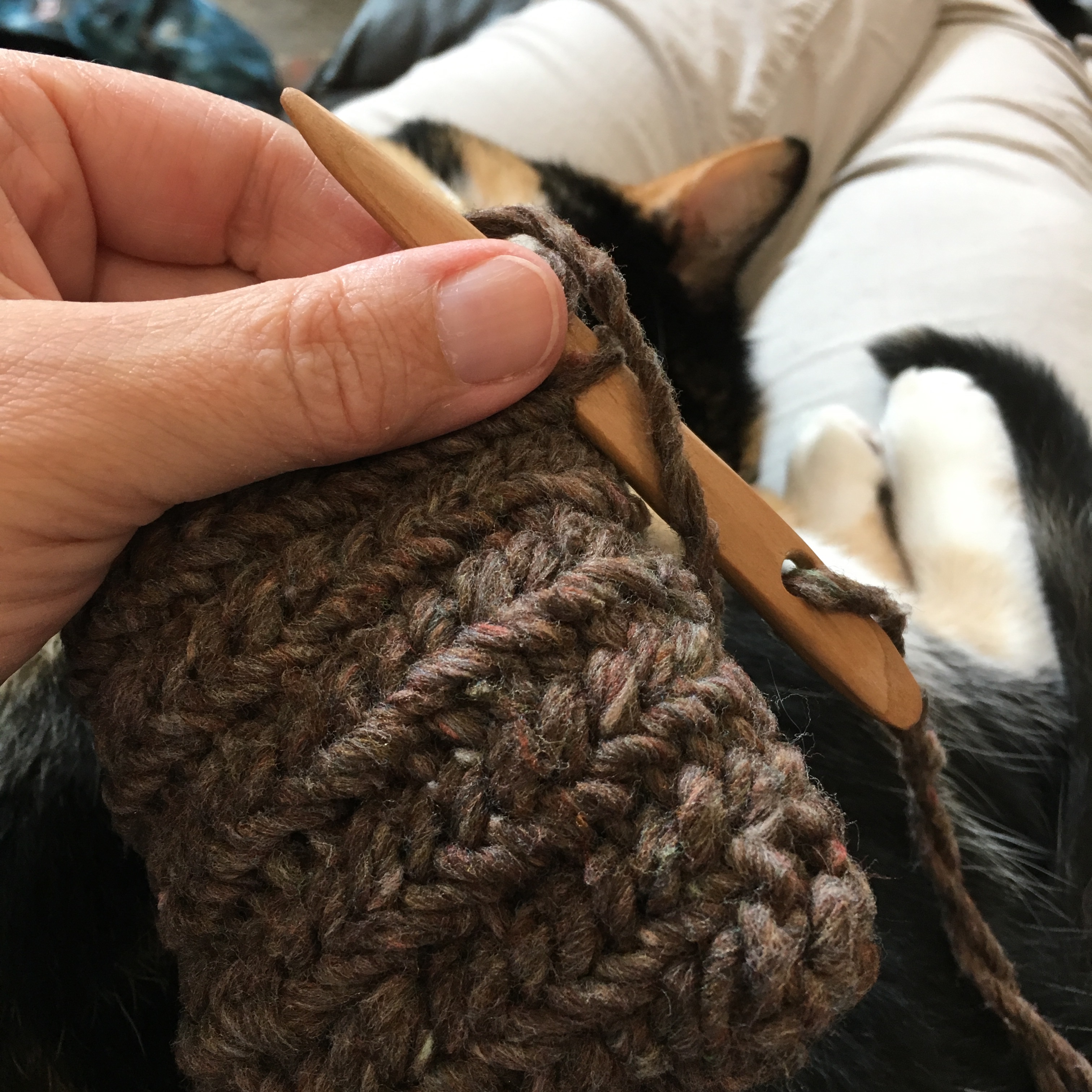 I actually quite like this technique. It feels like sewing, but creates a thick sturdy fabric with an interesting texture. It builds somewhat like crochet, but does not unravel (picking out stitches is a bear, let me tell you).