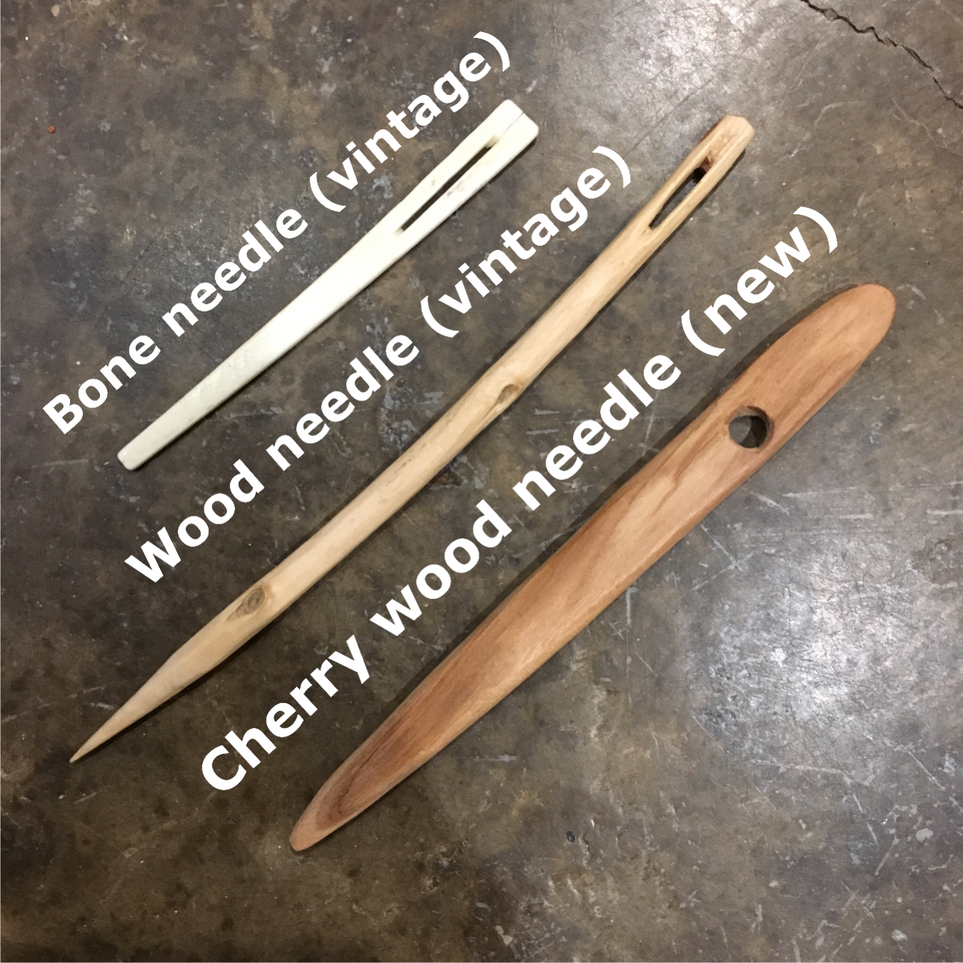 I get many needle craft pins rolling across my feed, and have been seeing the word nålbinding (or naalbinding, or nalbinding) for some time. I pinned one, then decided to delve deeper and found a website by Sanna-Mari Pihlajapiha full of interesting information. Nålbinding is basically using a needle to make connected loops to form a fabric. The needle she used looked very familiar, so I went through my stash (which is made up of items inherited from both sides of my and my husband’s families), and found handmade needles of bone and wood. The bone needle’s eye was cracked, so I didn’t want to risk trying to use that, so I started with the wooden (possibly diamond willow) needle. This turned out to be too sharp for the homespun (possibly) wool I also found in my stash. So I made my own needle fashioned from scrap cherry wood left over from spoon making. The flat wide shape is actually easier to use for nålbinding.