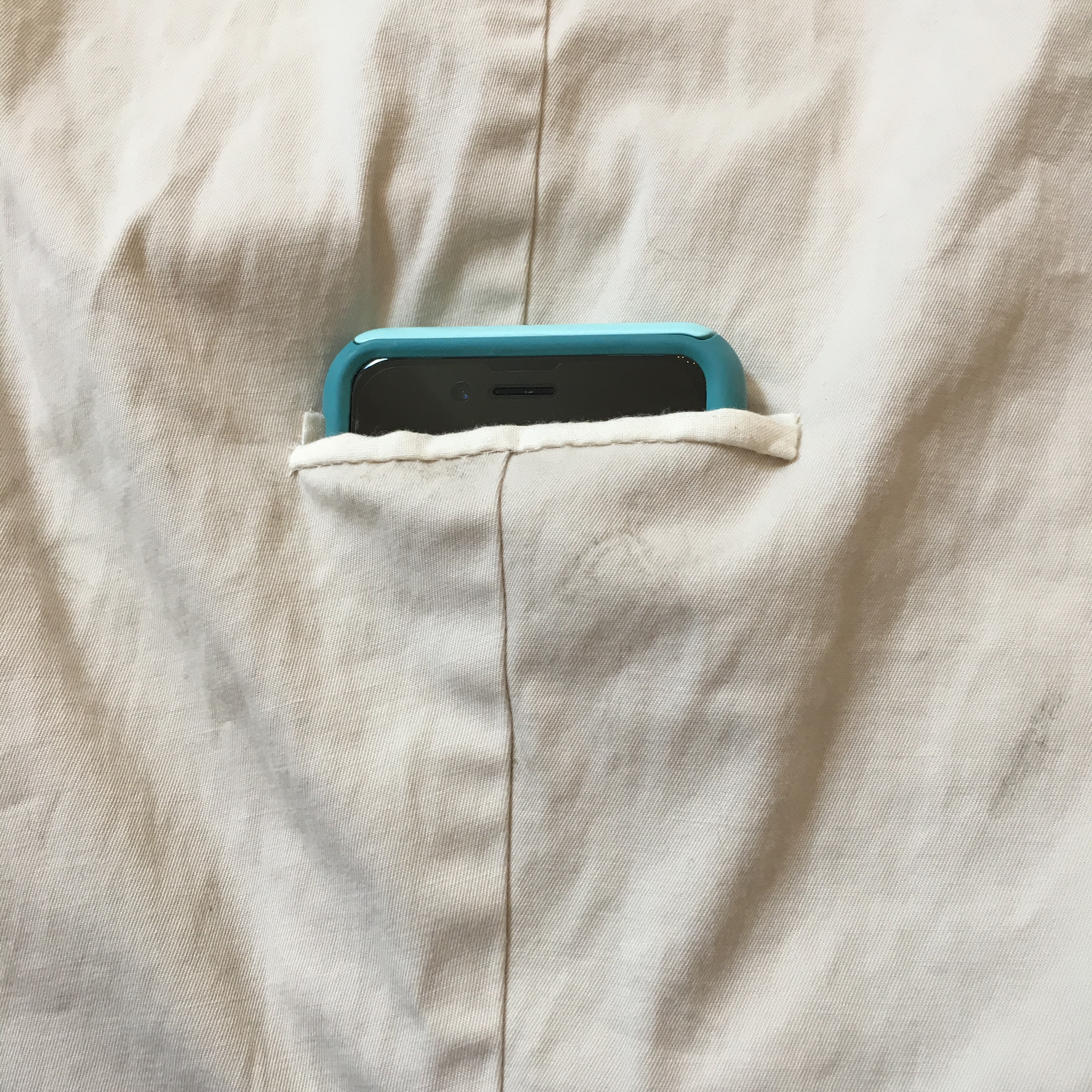 So I came up with a way to add a pocket. I like the mid-leg pockets because there is less stress on the phone (I’m not sitting on it!). I tried some surface pockets, but these inside pockets hold the phone better and look nicer.