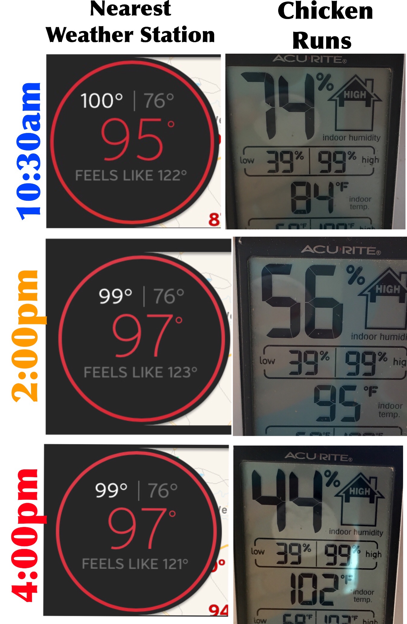 I did a little data collection. The high was forecast to be 100, and at 10:30am I was quite excited that the chicken’s runs were still in the 80s even though the nearest station was reading 95 degrees. Then 4pm happened. 102 degrees in the shade. Yuck.