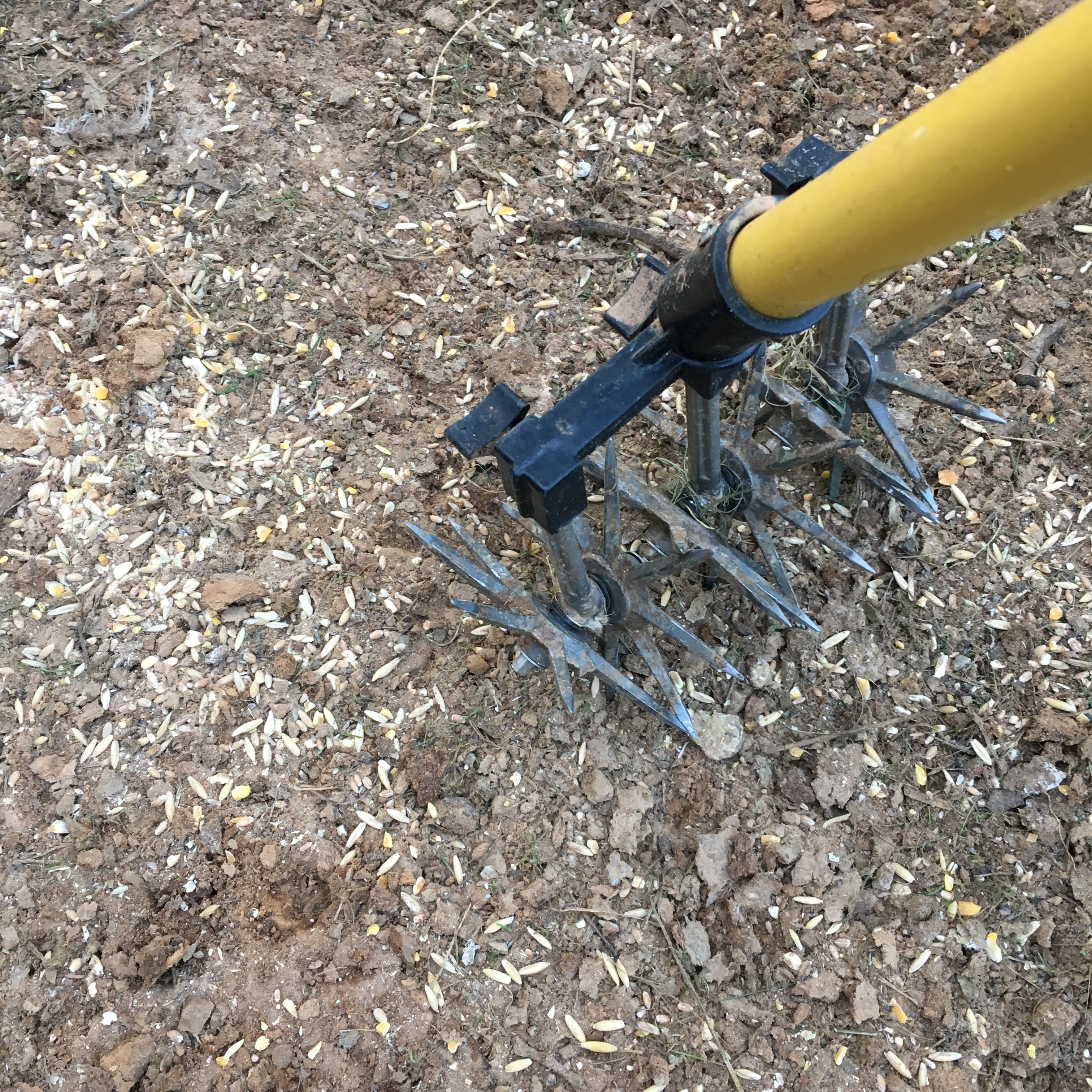 I used a small cultivator to break up the soil, spread the scratch mix, worked the seeds lightly into the soil, and watered 2-3 times a day (now we are drying up).