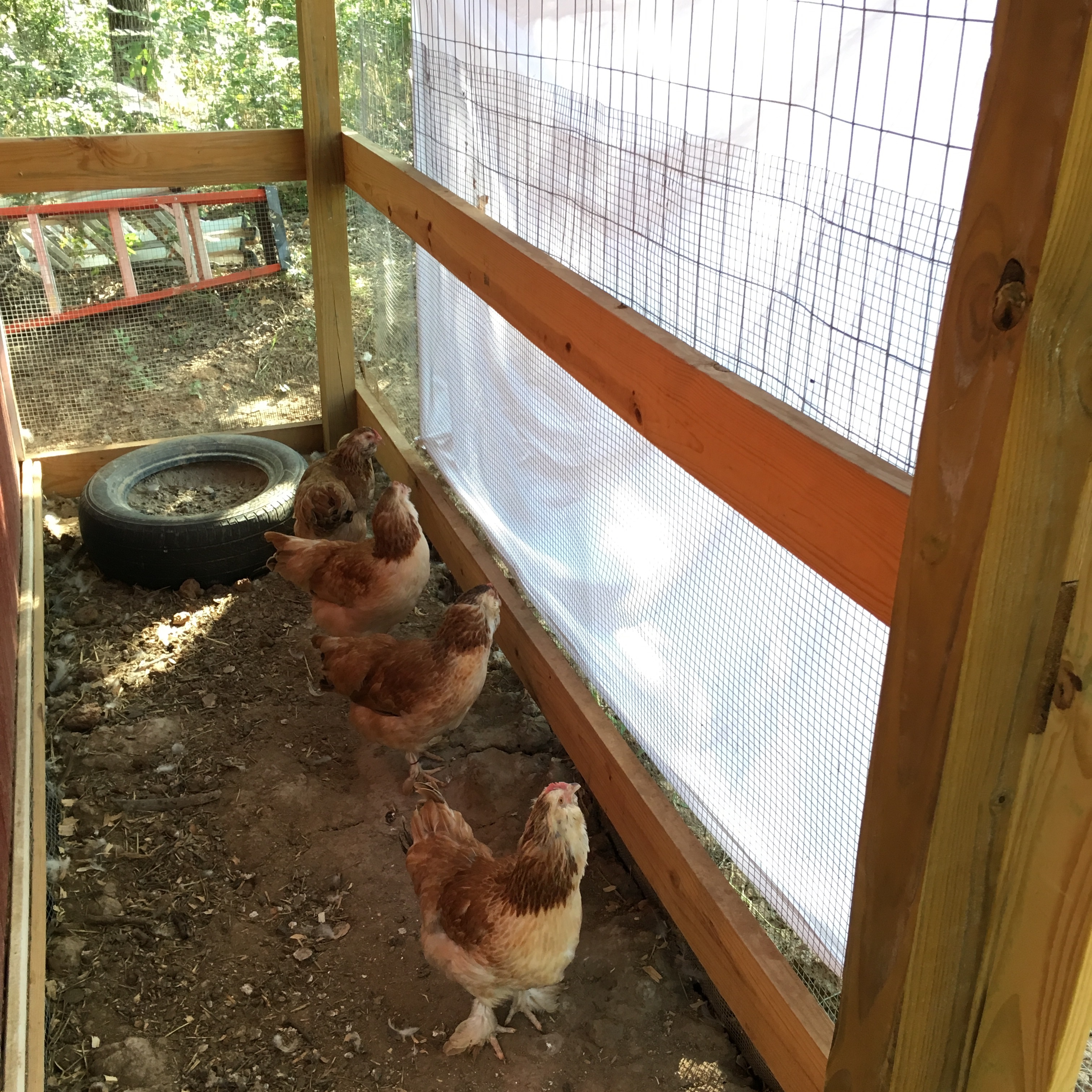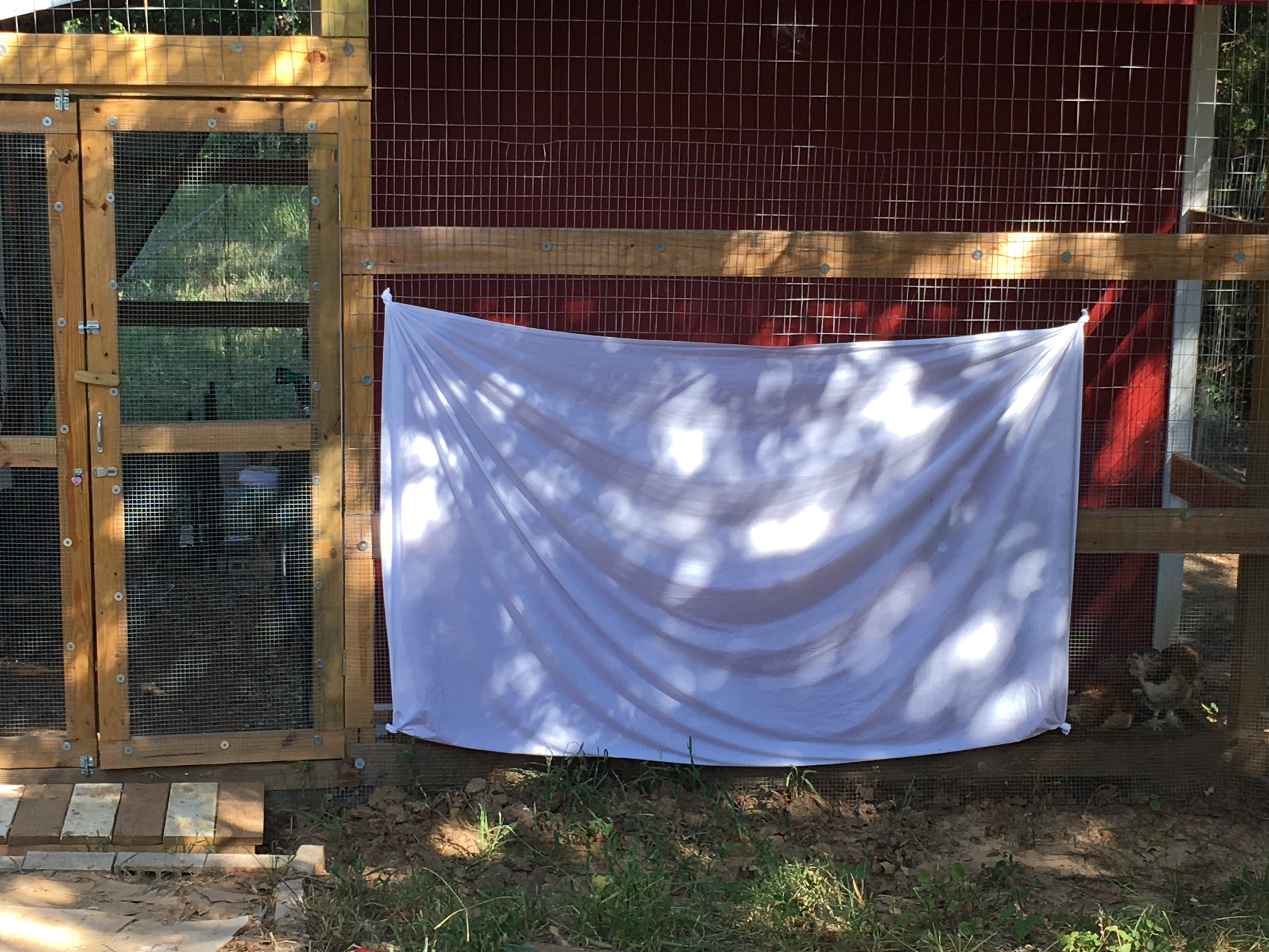 So I grabbed a cotton flat twin sheet and tied it to the hardware cloth and wet it down with the hose. The chickens were not scared of it, which is a big plus. Time will tell if it provides them a more comfortable area.