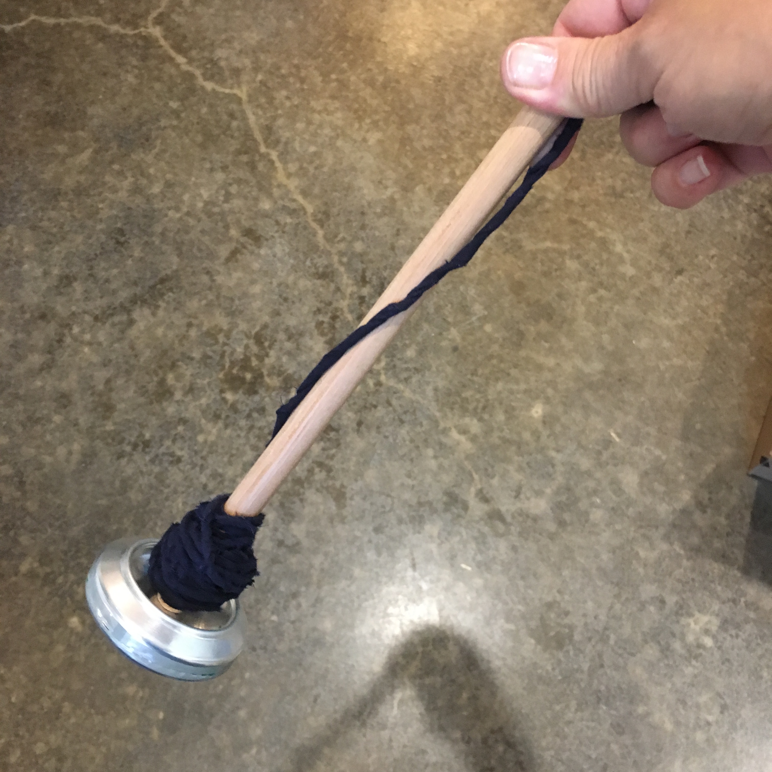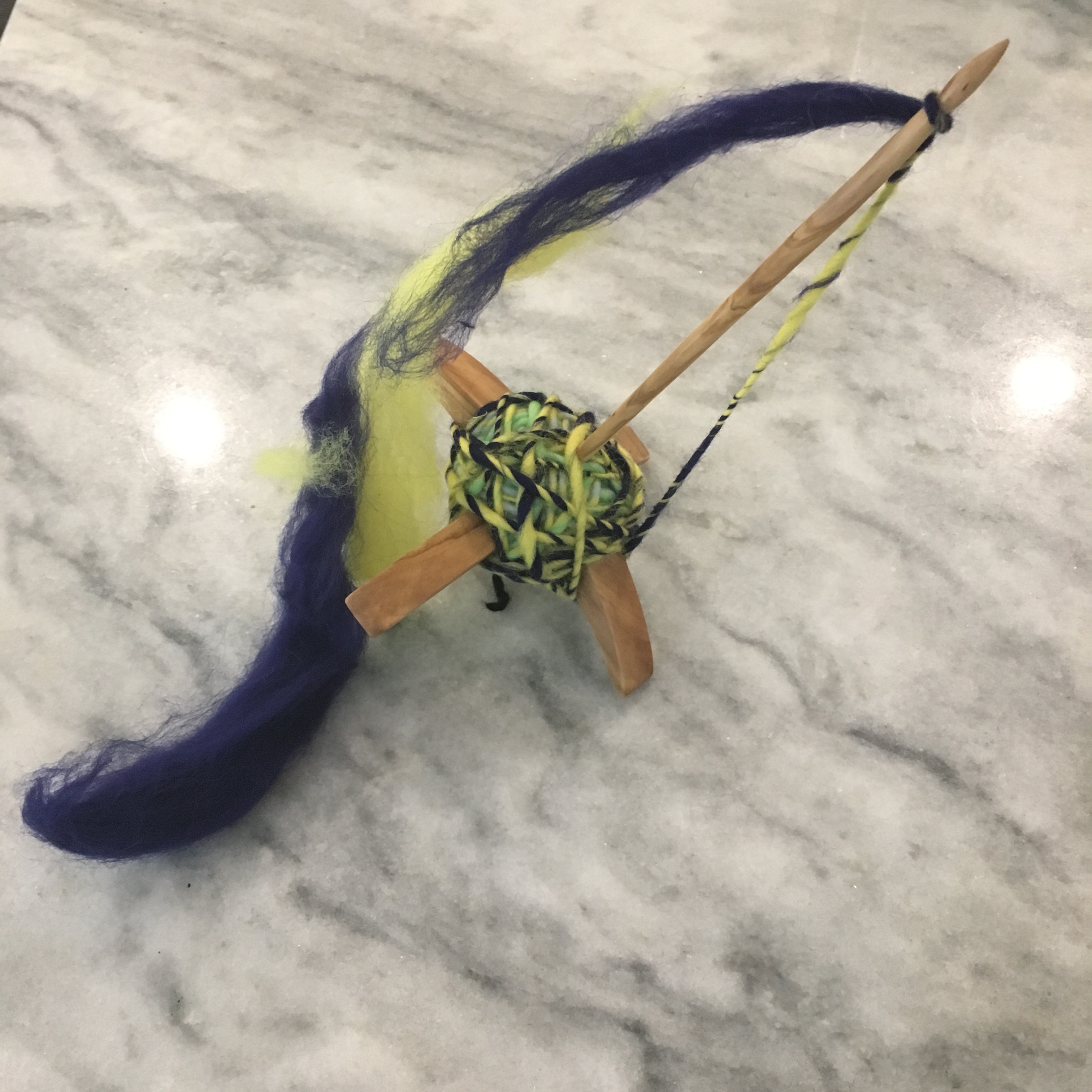 After learning how to twine by hand, I started to want to know more about spinning yarn (next logical step, yes?) I didn’t want to jump into buying a spinning wheel, but I saw many Pinterest posts about drop spindles. I admit, I attempted to make a drop spindle from a hooks, a dowel, a screw, some play dough, and the bottoms of aluminum cans. I used the bottoms of two aluminum cans filled with play dough to give it weight.