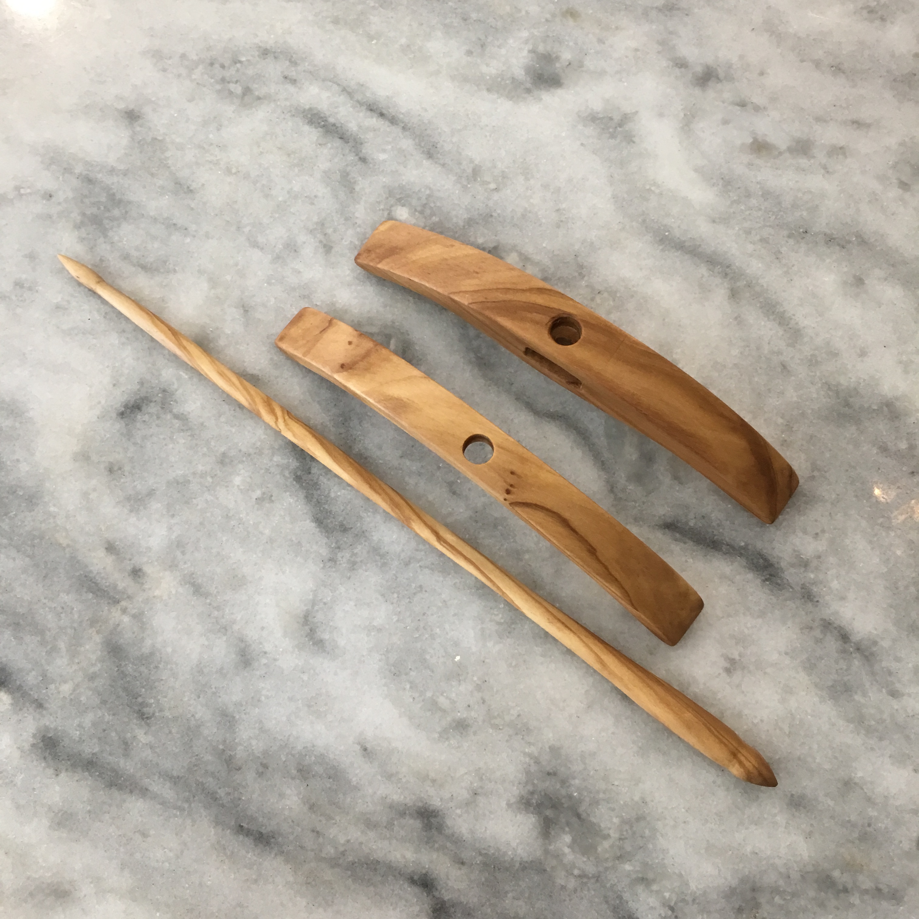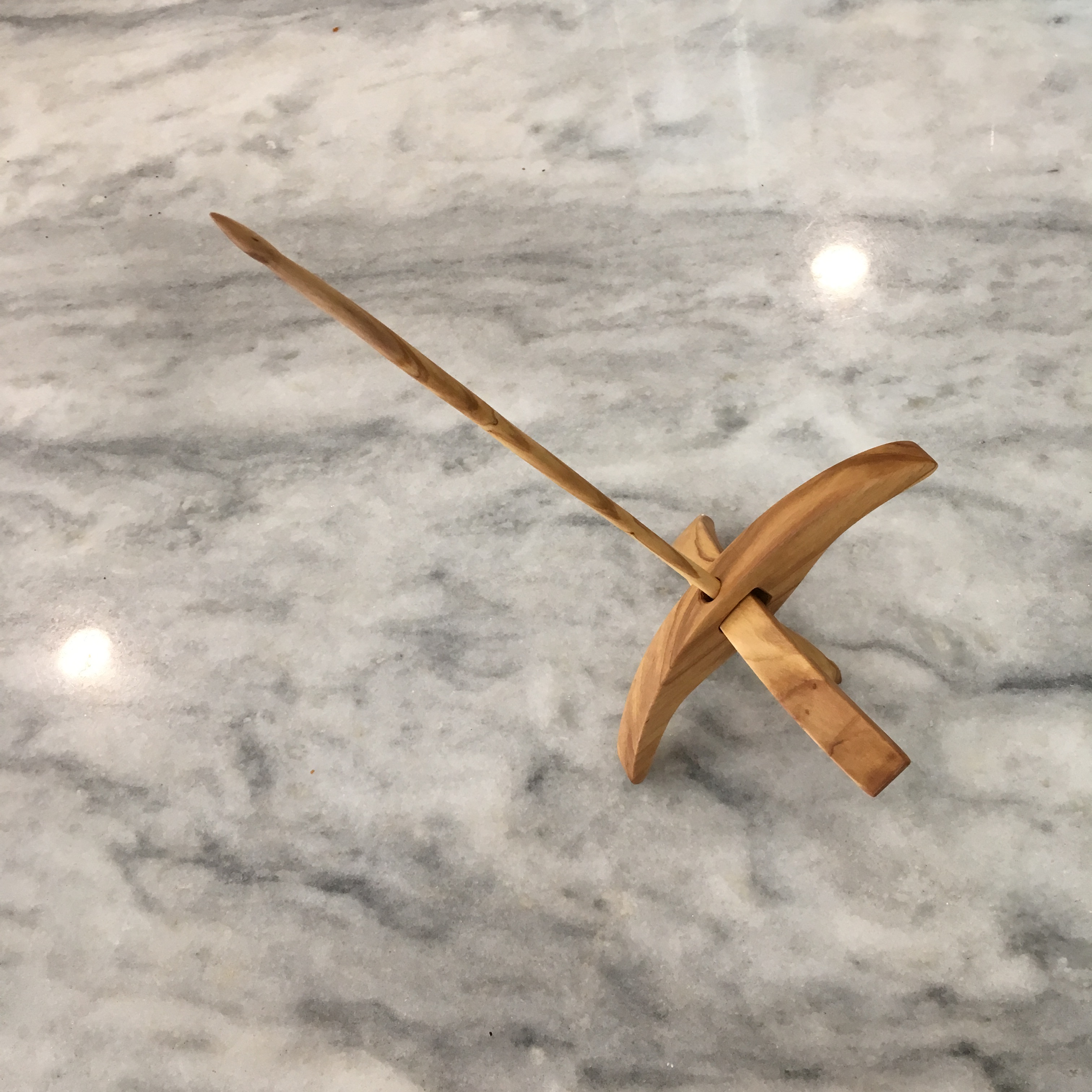 I had left over Roman Olive Wood from a spoon I had made, so I planned out my spindle design, used the bandsaw to rough cut the shapes, a drill press to rough cut the slot and drill the spindle holes, and a chisel to refine to slot. I then sanded the whole thing first with a belt sander, then by hand. I finished it with Tung Oil (which took several days, argh, the waiting!).
