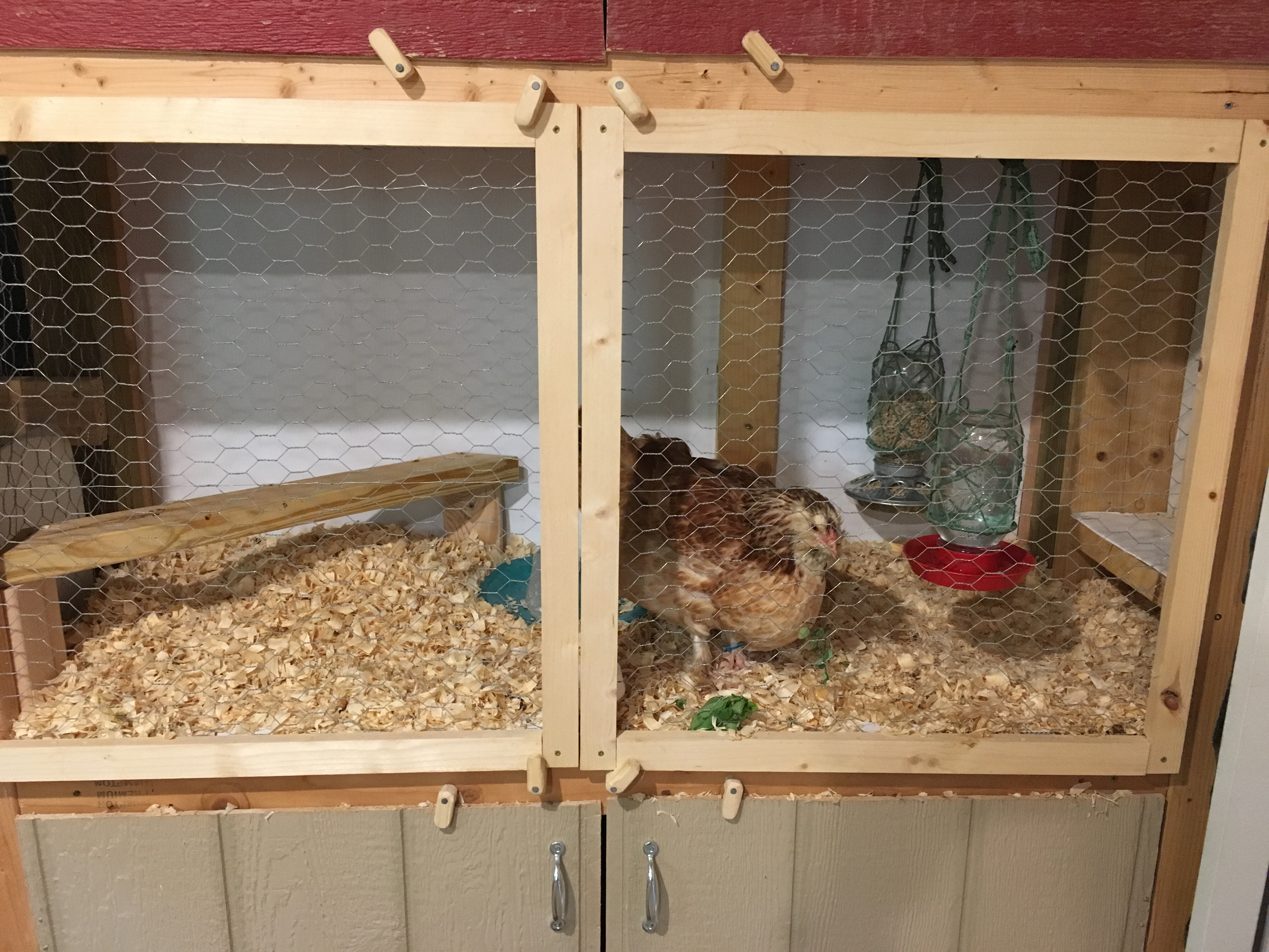 We’ll see if this treatment helps Navi. She is in isolation, but I’m glad I took my Dad’s advice because the isolation ward is at a good height, I can lean in, and it is plenty big for one chicken. Navi can see the other chickens, has a roost, food, water, and even a small foot bath. Although with her medicated water, she only gets a frozen water bottle on a plate so she doesn’t drink foot water. Ugh.