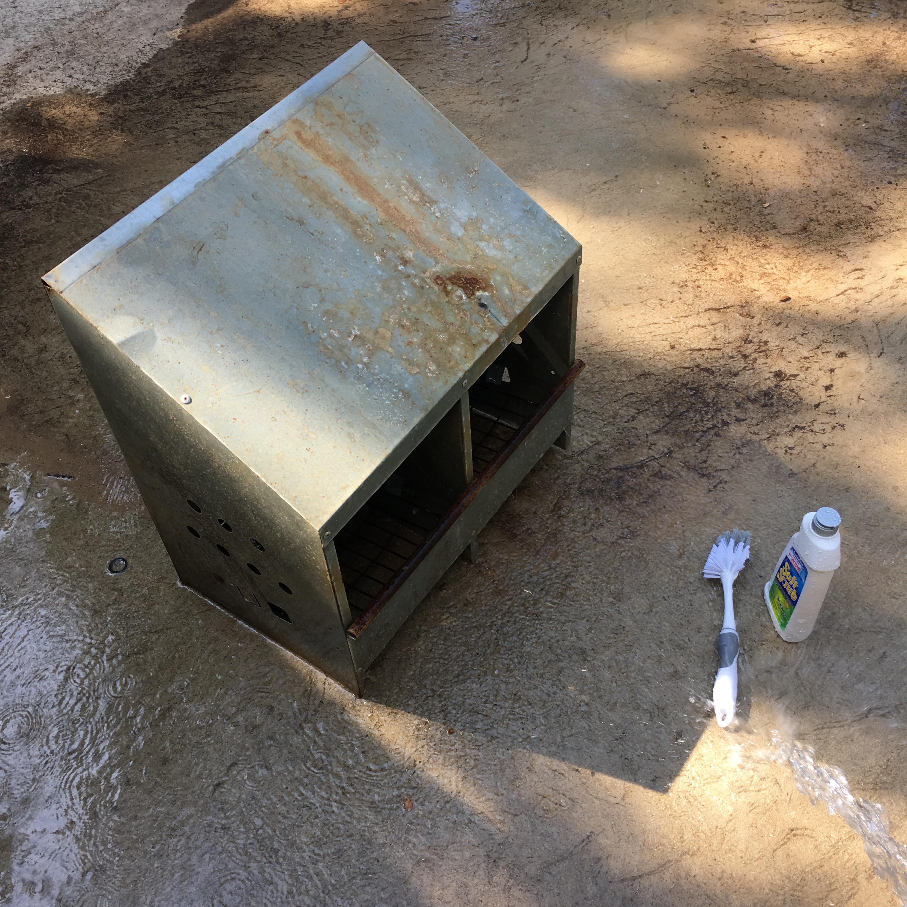 I figured out that I could make more room by dropping down the front panel a couple inches. I drilled out the rivets and scrubbed the box with bleach soft scrub (who knows how many chickens used this before!!) The boxes were designed to have an egg portal in the back for collecting. In my coop this isn’t practical, but the wire bottoms are extremely sturdy, so I scrubbed them too.