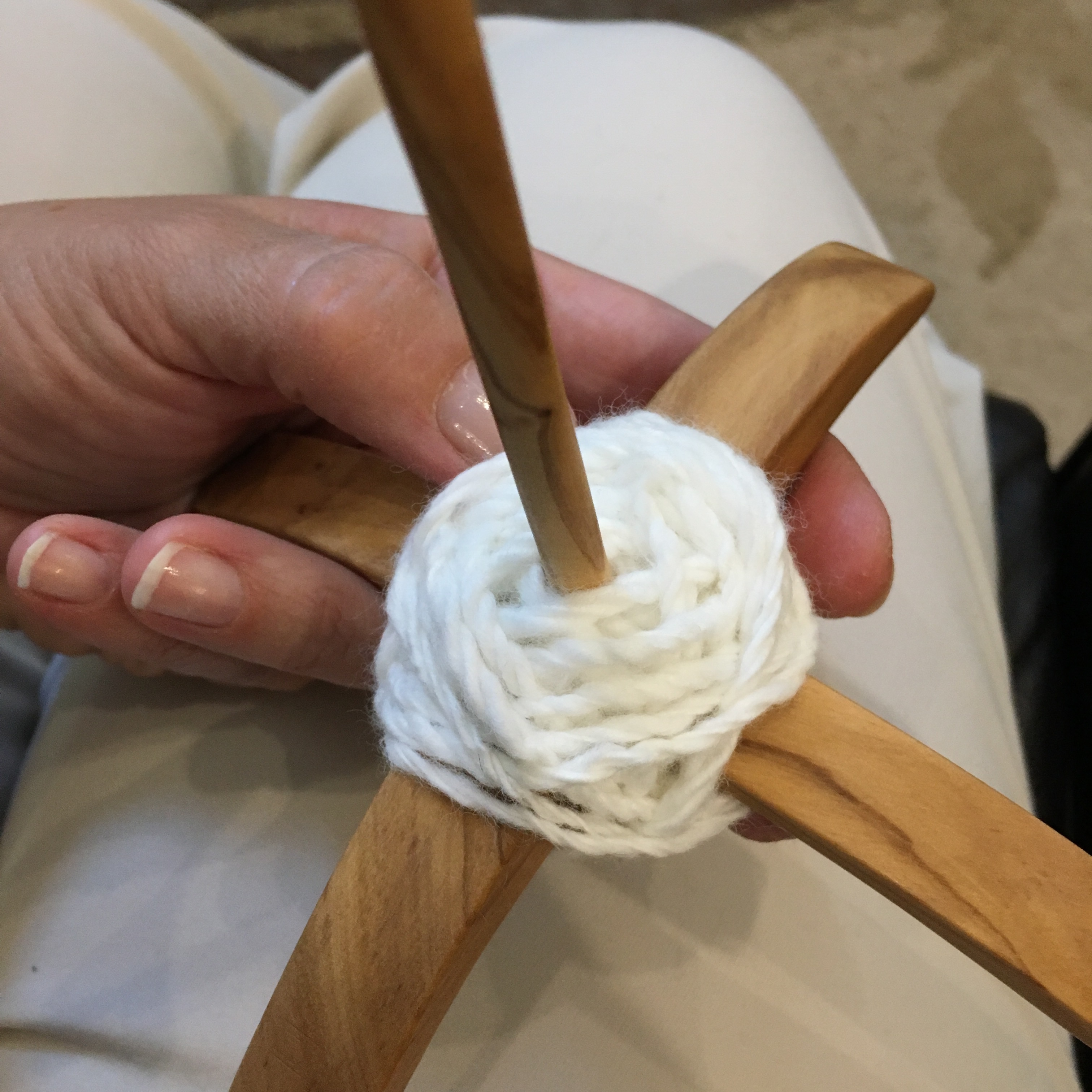 So I meandered over to YouTube and flipped through a couple videos. Cotton is a short staple fiber, and I’d read that drop spindles are usually too heavy to spin cotton (I only had a drop spindle, and a fairly big one at that). I saw a video on how to spin cotton balls on a pencil. I tried that, but with a large knitting needle, but didn’t have much luck.
