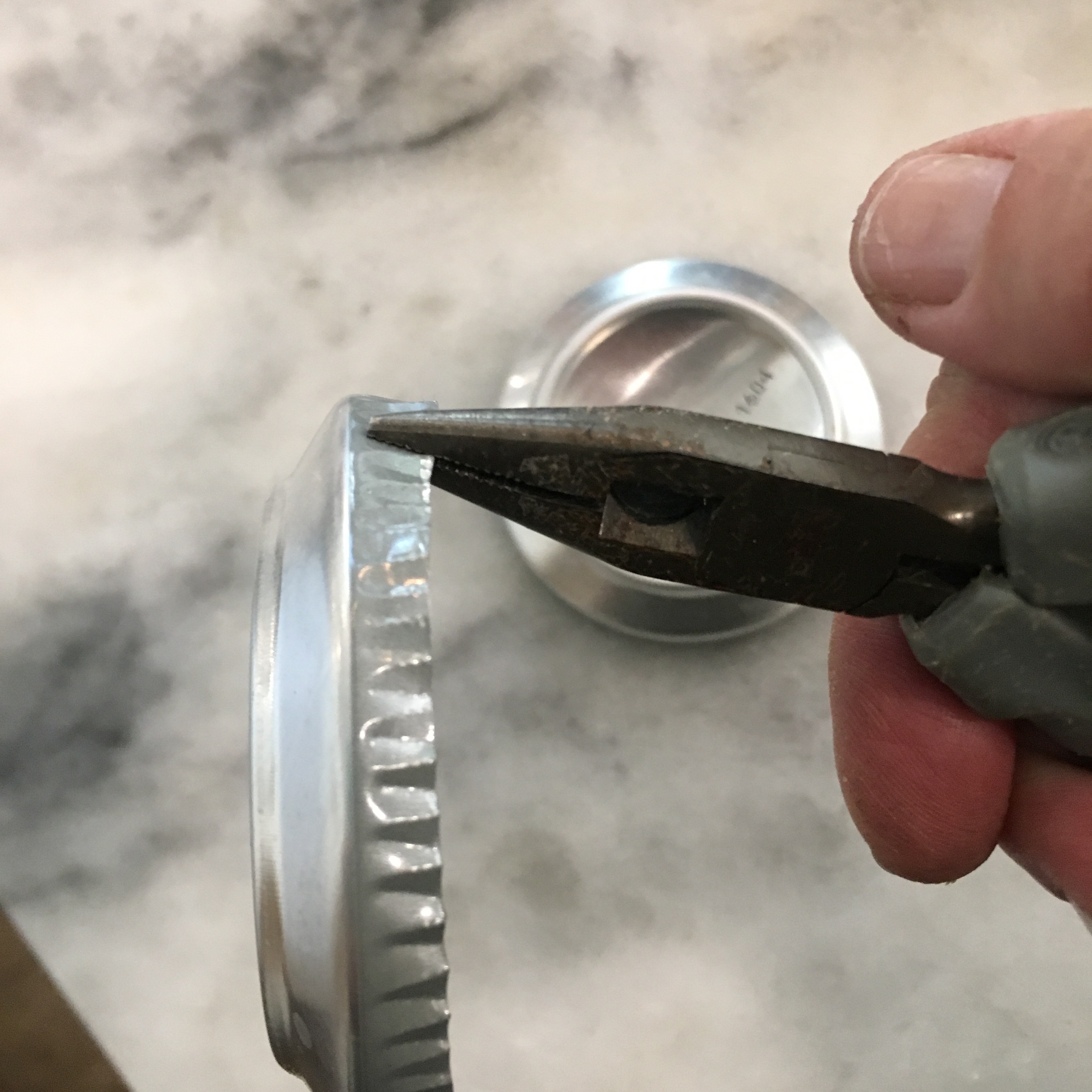 Using pliers and a half-twist motion, I crimped the edge of one can bottom. This helps it fit inside the other can bottom nicely. I learned this technique from a video where they used aluminum can bottoms to make toy car wheels. Cool. This is also how I made my first whorl.