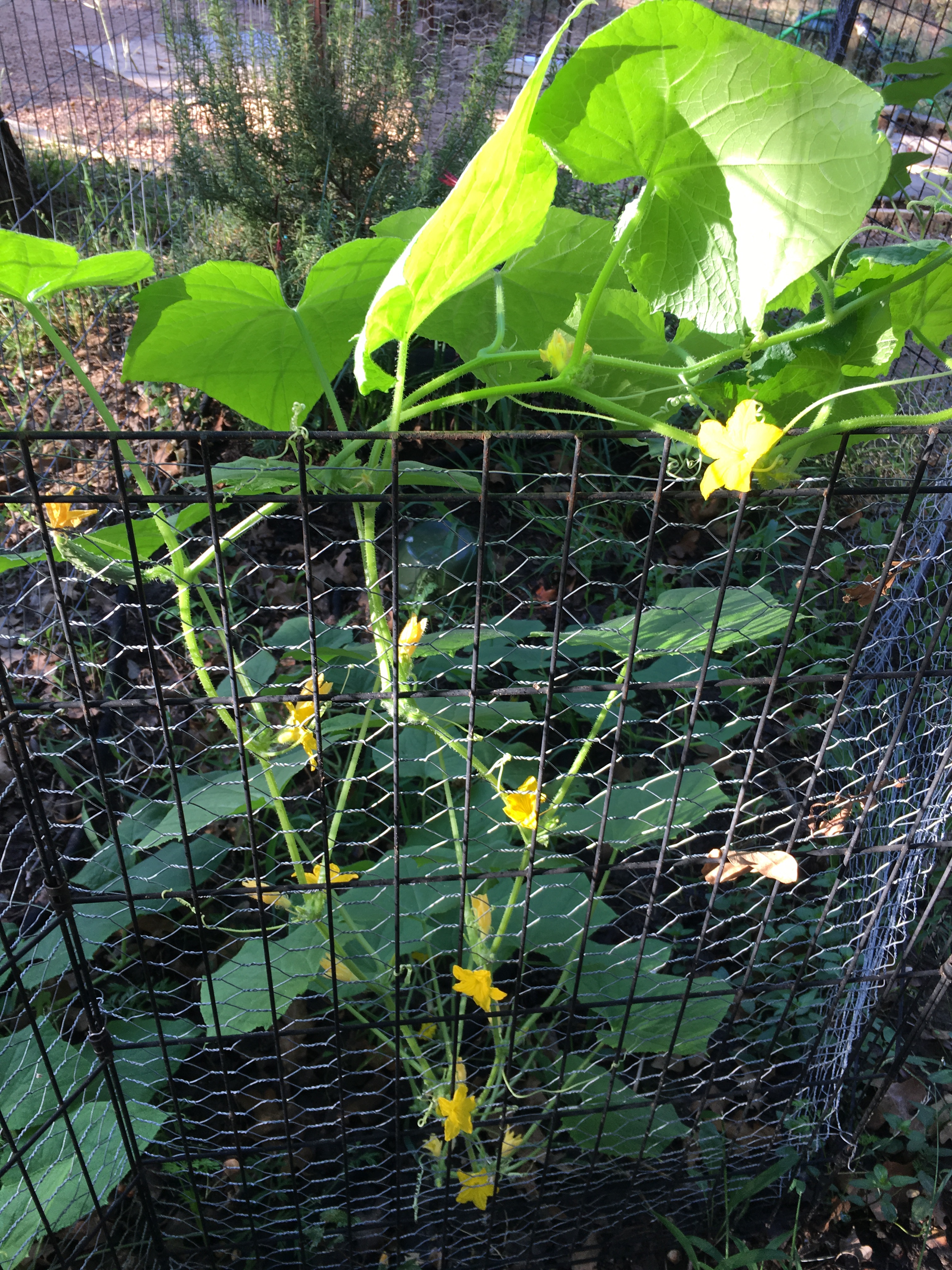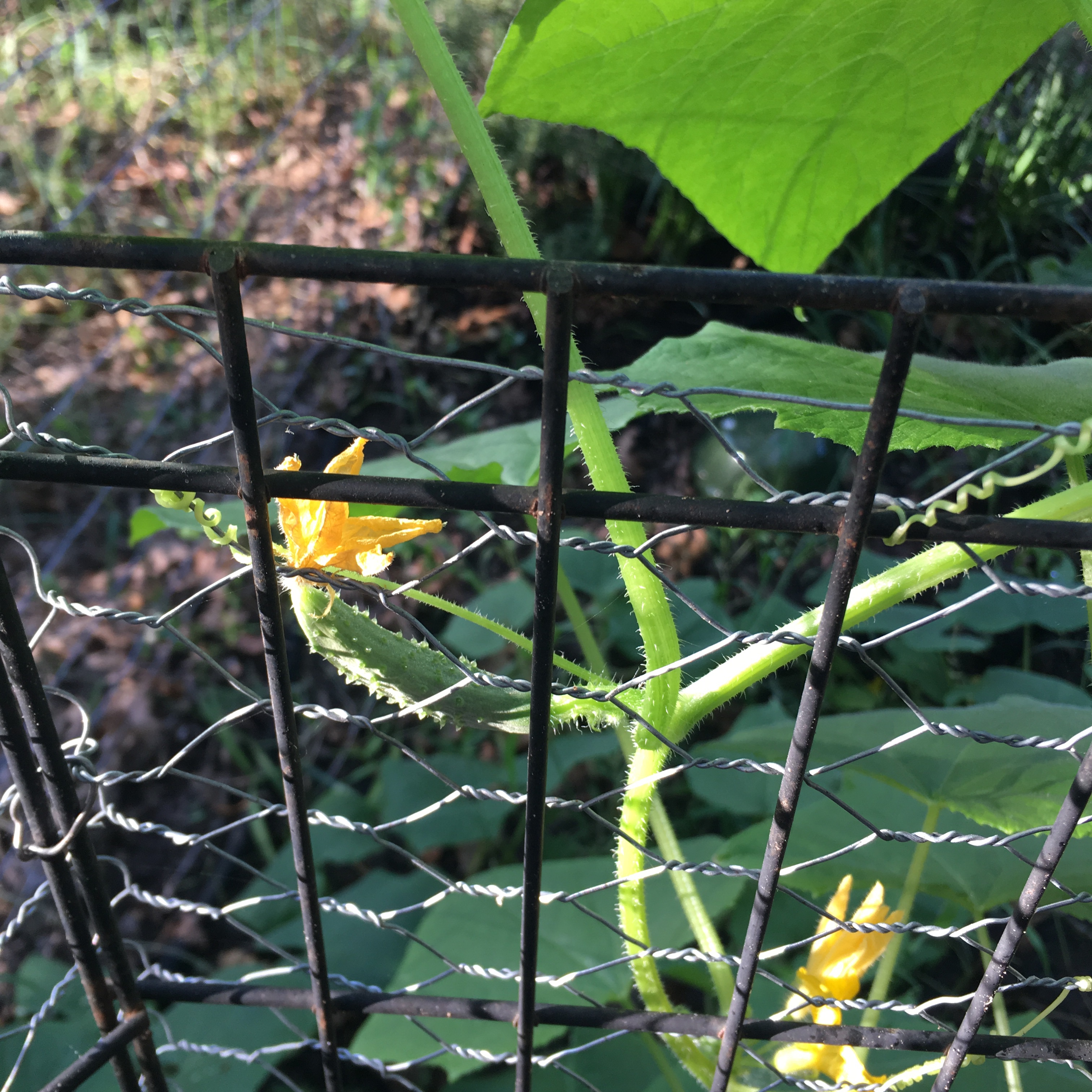 The cucumber vines are happy in their wire enclosure (recycled from the cage we cobbled together for the growing chicks), and are now climbing the wire. I put up the wire the keep the critters out, but I’m happy that the cucumber is up off the ground.