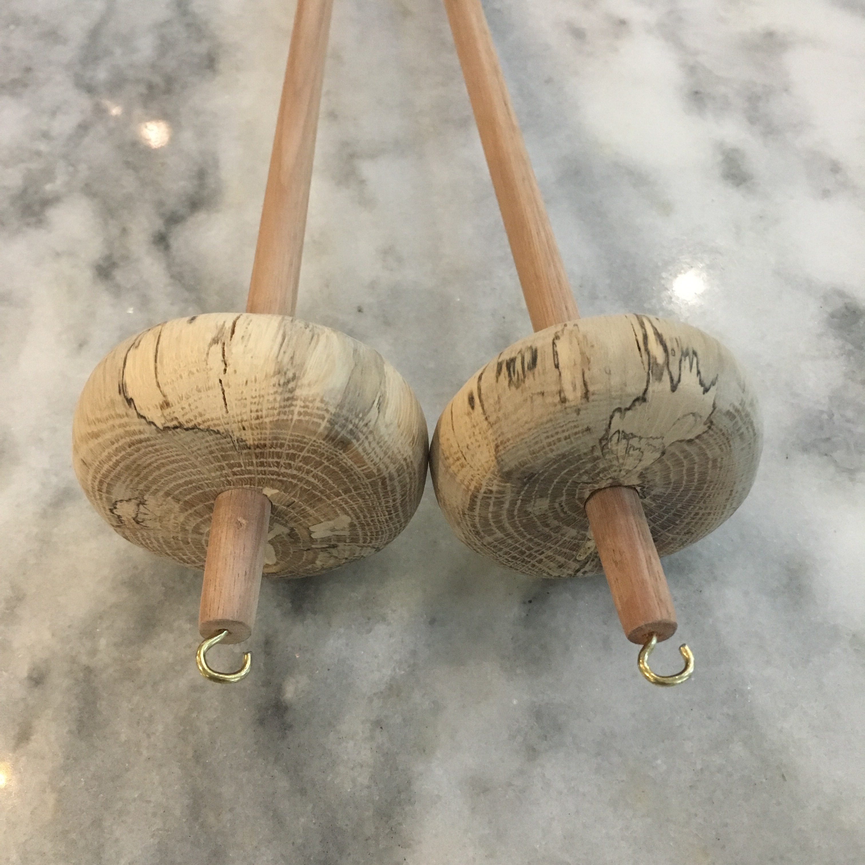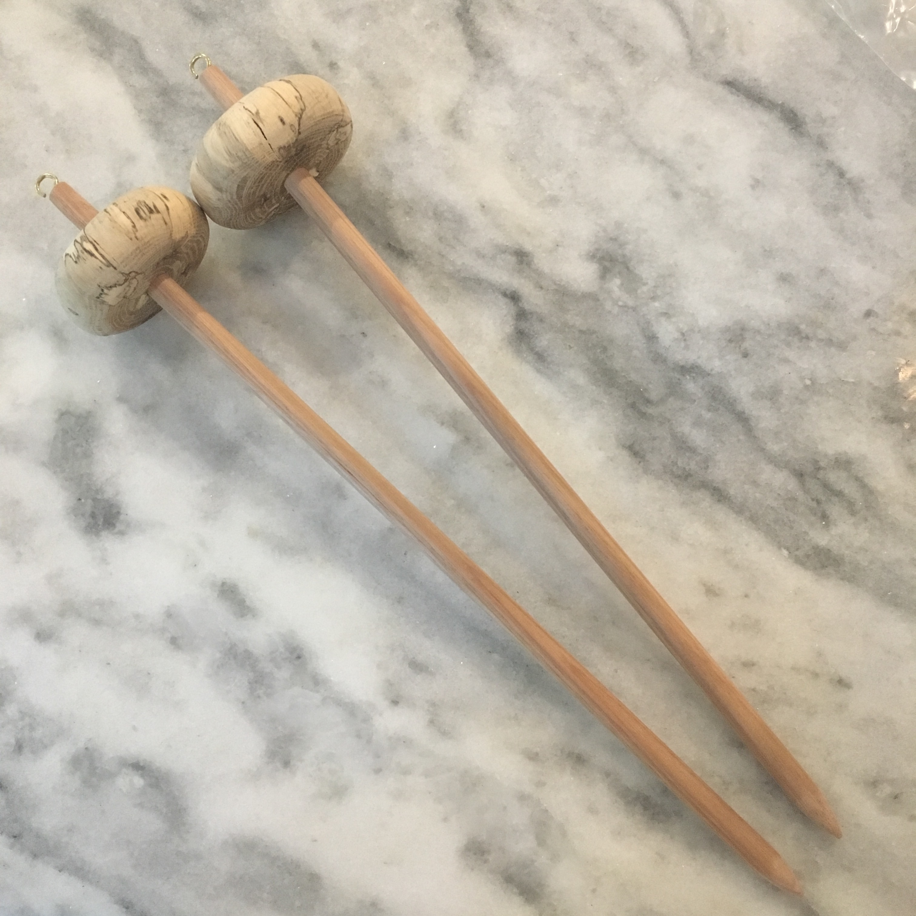The whorls on these are made from either post oak or cedar elm (we have both on the property). I took a branch that has been sitting my log pile for about a year, cut slices, then sanded the slices into donut shapes. The shafts are store bought dowels, with one end sanded to a point and the other end has the diameter reduced slightly to hold the whorl. They aren’t perfect, but they function ok and are pretty. It does make me want to get my lathe up and running again so I can make perfectly round whorls.