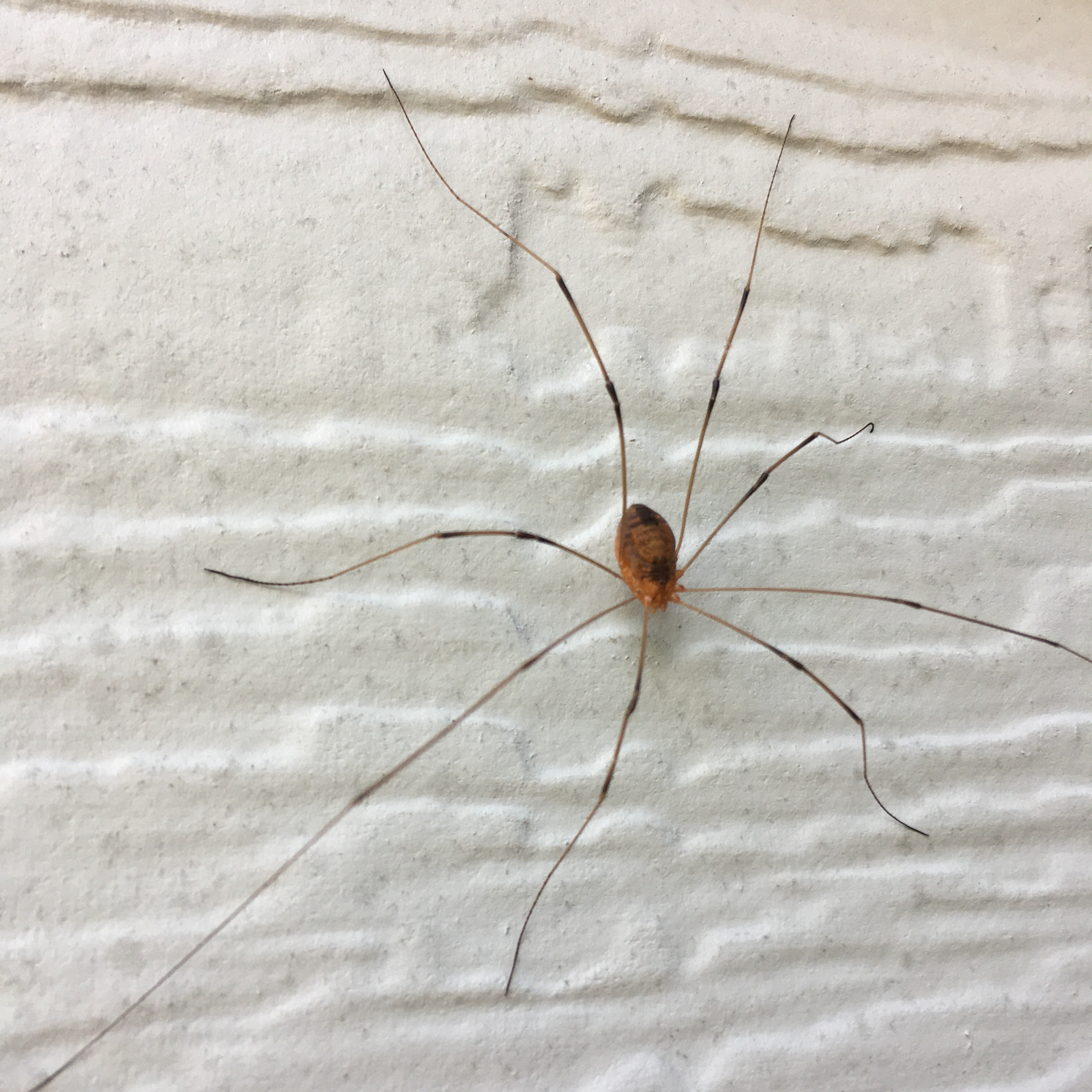 I grew up calling these arachnids “Daddy Long Legs”. This bad boy is about six inches from leg tip to leg tip and one of the largest I’ve seen (they grow them big in Texas). I plugged the photo into iNaturalist and their algorithms gave me the order of Phalangida. Wikipedia says the order is now called Opiliones and are also known as harvestmen (which seems much more sinister to me than daddy long legs, but maybe I watched too many old horror flicks as a teen). The Wikipedia article (https://en.m.wikipedia.org/wiki/Opiliones) is quite detailed and may seed some more nightmares, even though these guys are harmless to humans.