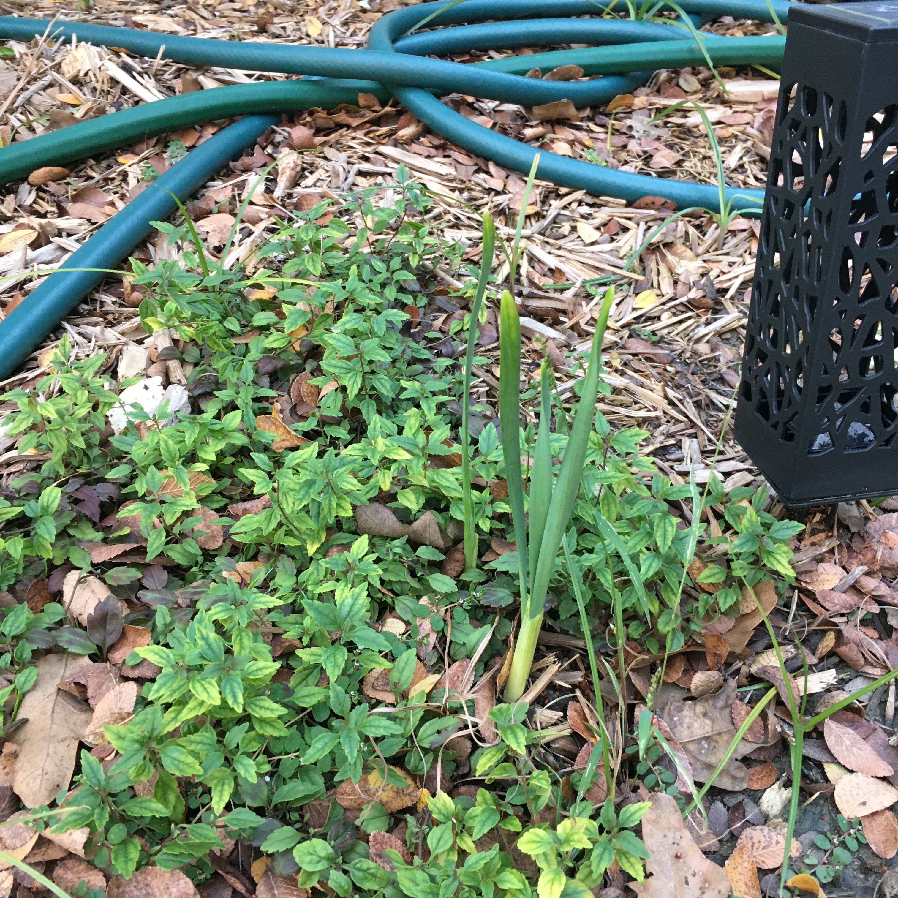 More anachronisms. My daffodil bulbs have decided to sprout… in October. (The tall leaves coming up through the ground cover in the picture.) I wonder how that is going to work out for them? Between the June bug earlier this week, and the daffodils, it also makes me wonder what winter will bring this year.