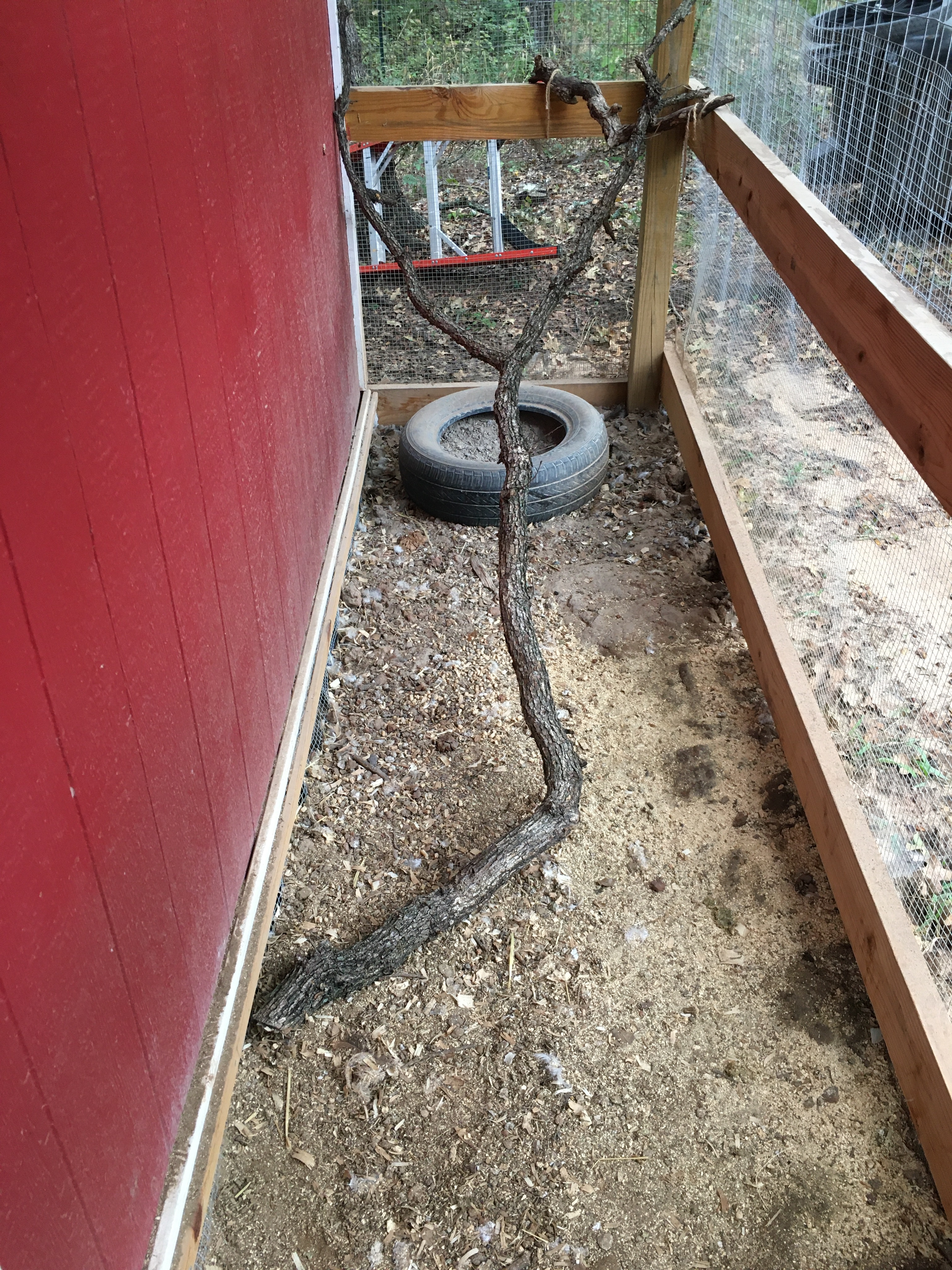 It has been cold and rainy and I tried to make the chicken’s covered run more exciting by putting in a large branch. The branch has been sitting behind the coop for awhile, so cleaning off the tiny branches to make it more roost friendly was easy.