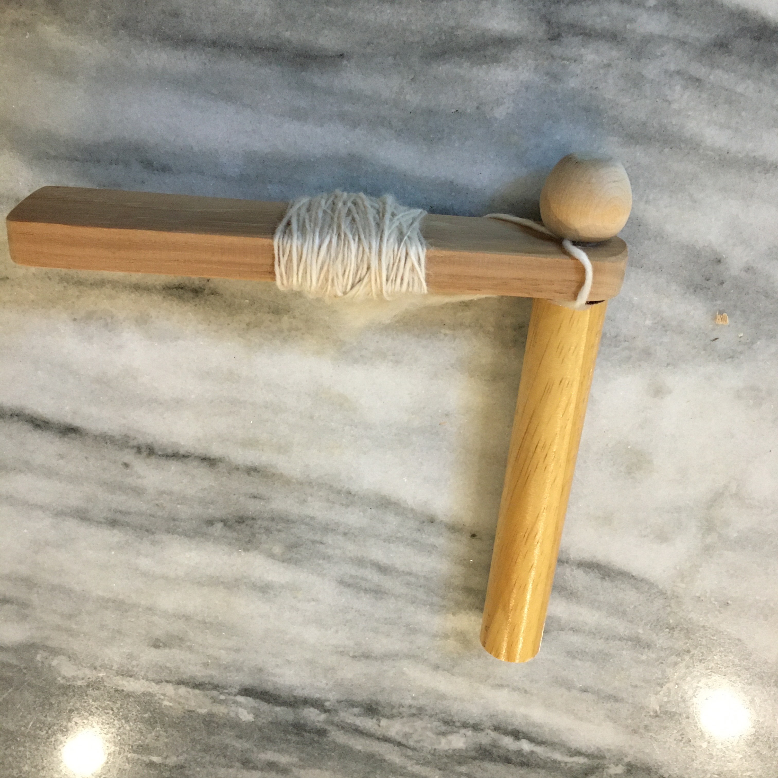 I tried another kind of spindle: a Mayan spindle. It uses a paddle on an axel to generate spin, and I’ve read that it is easier to use in confined spaces.