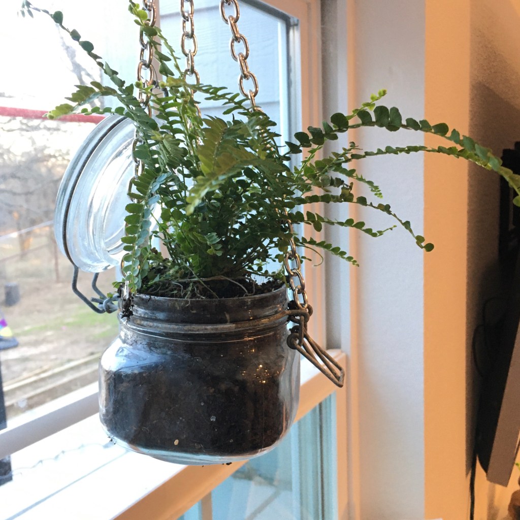 Having the lid hang down threw off the balance of the pot, so I wired it up onto the chain. The fern is now in a north facing window, so gets light, but not full sun. We’ll see how it does!