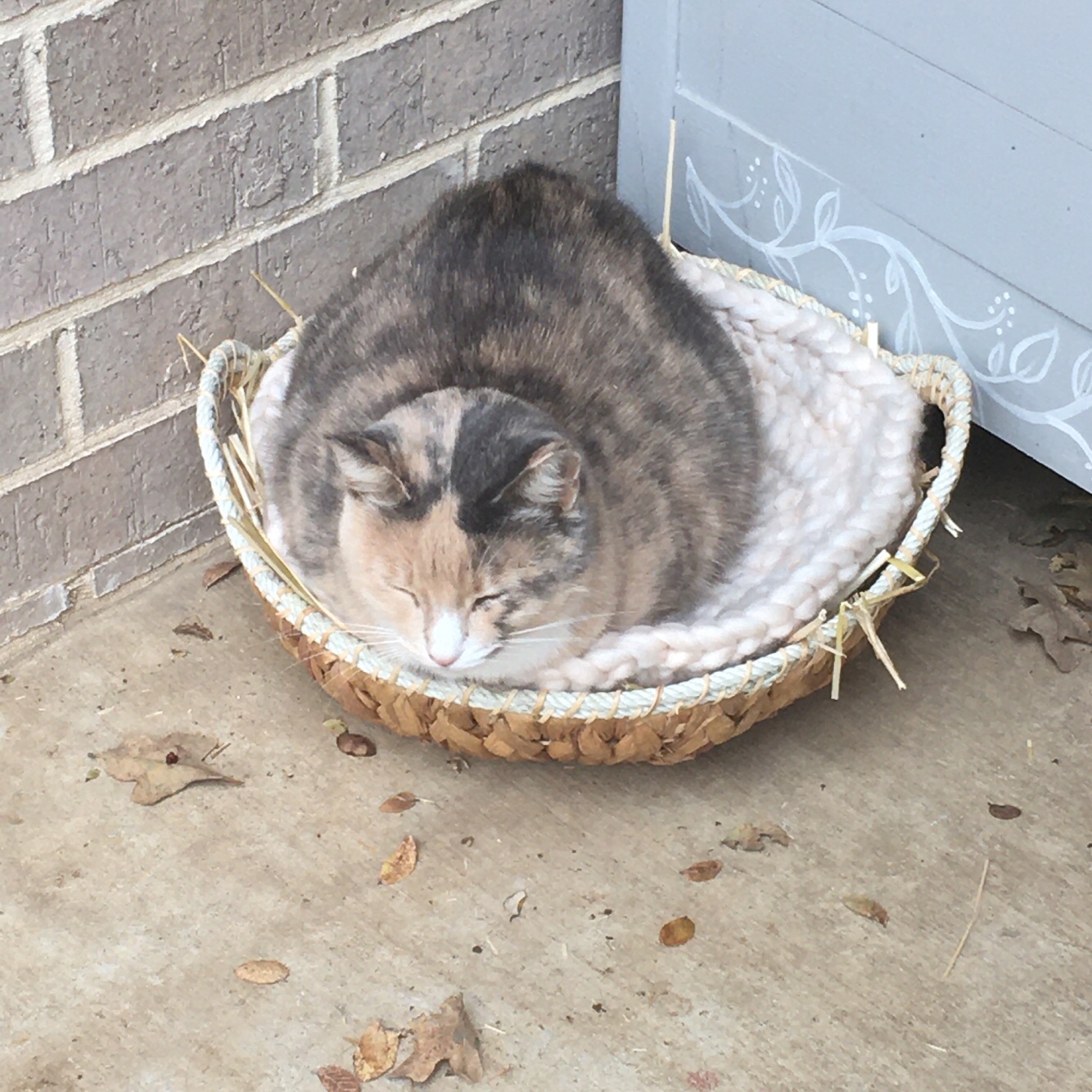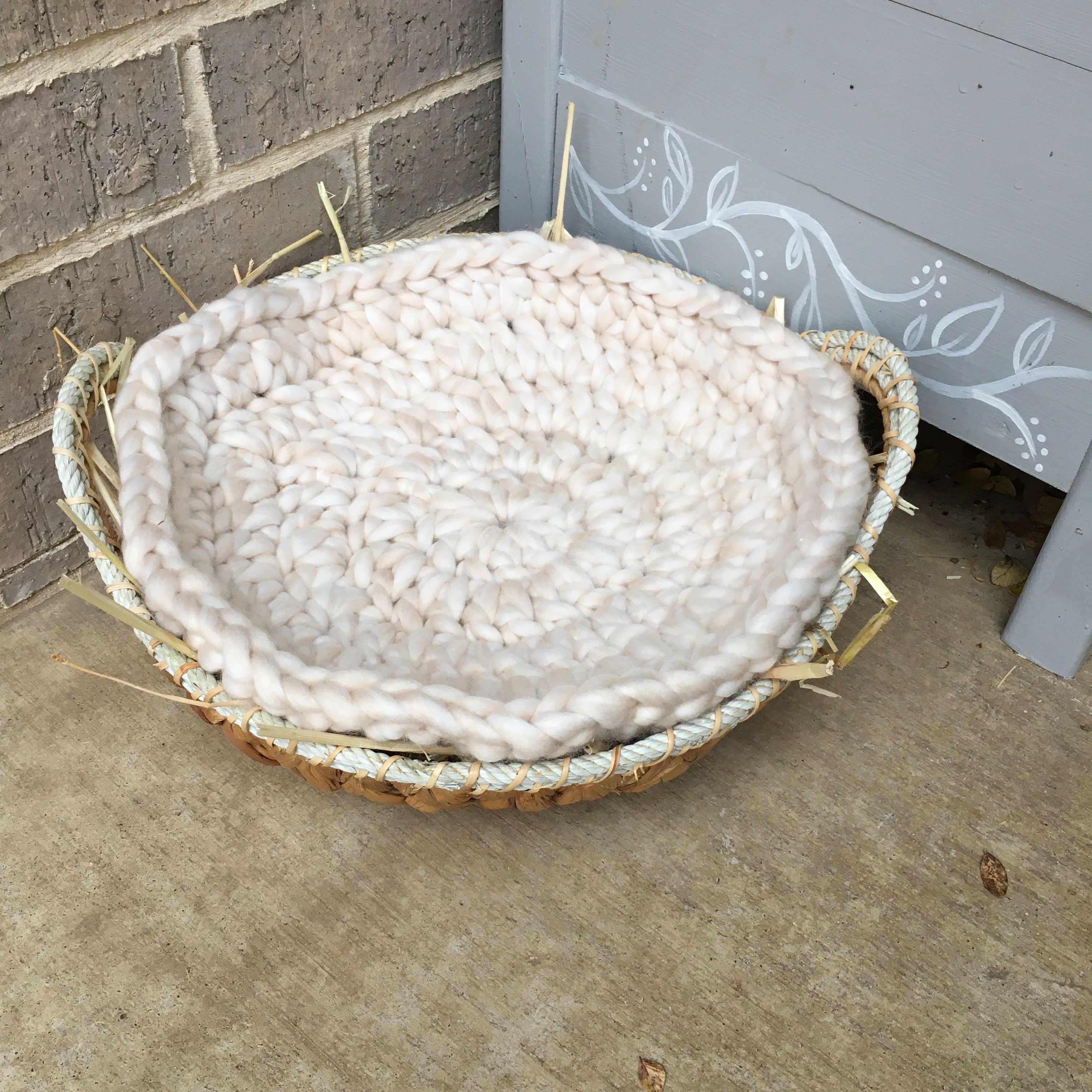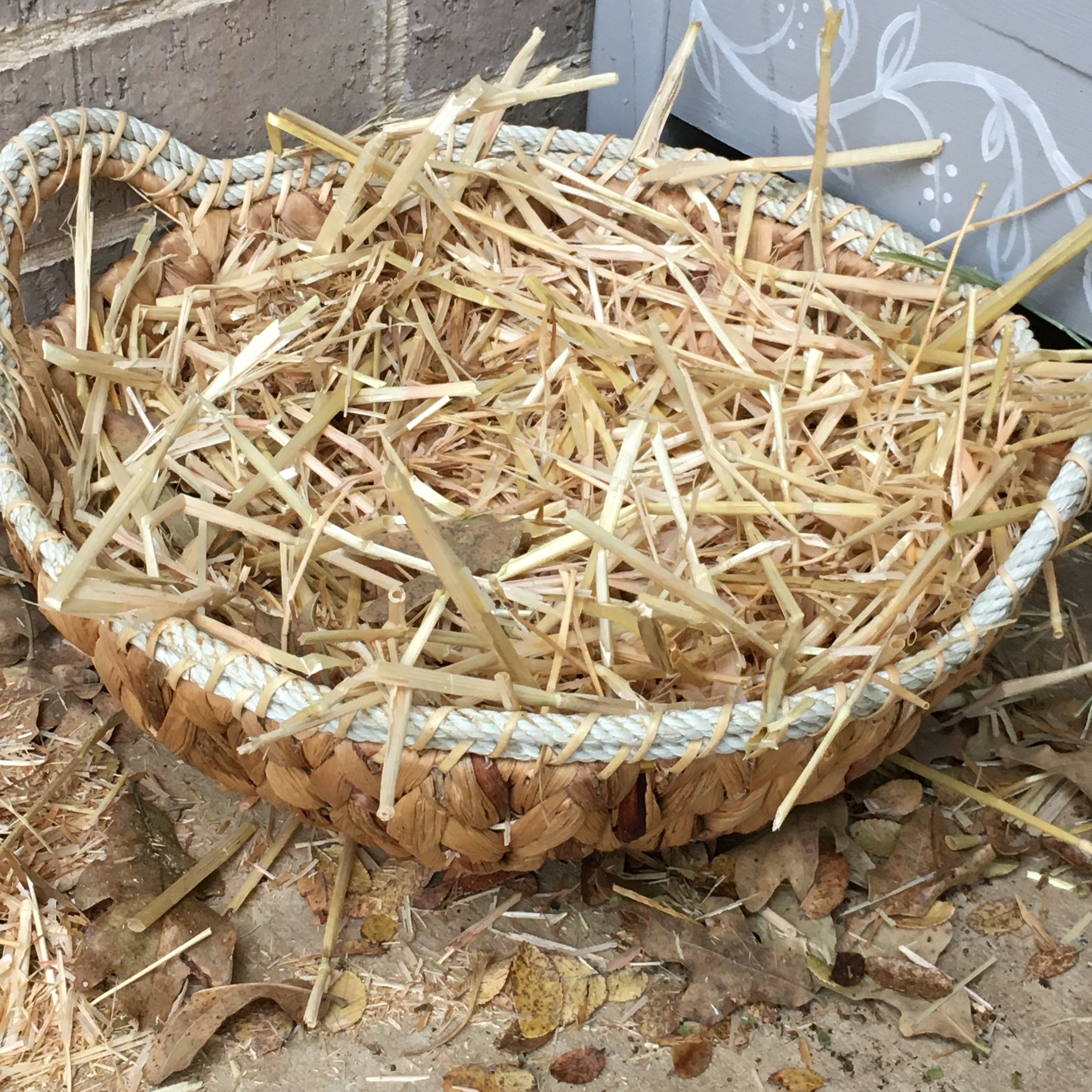 Although she is cute pretending to be a plant, I don’t want to encourage the behavior so eventually I can actually have green plants in there. I bought a cute woven hyacinth basket and filled it with straw, but she was unimpressed.