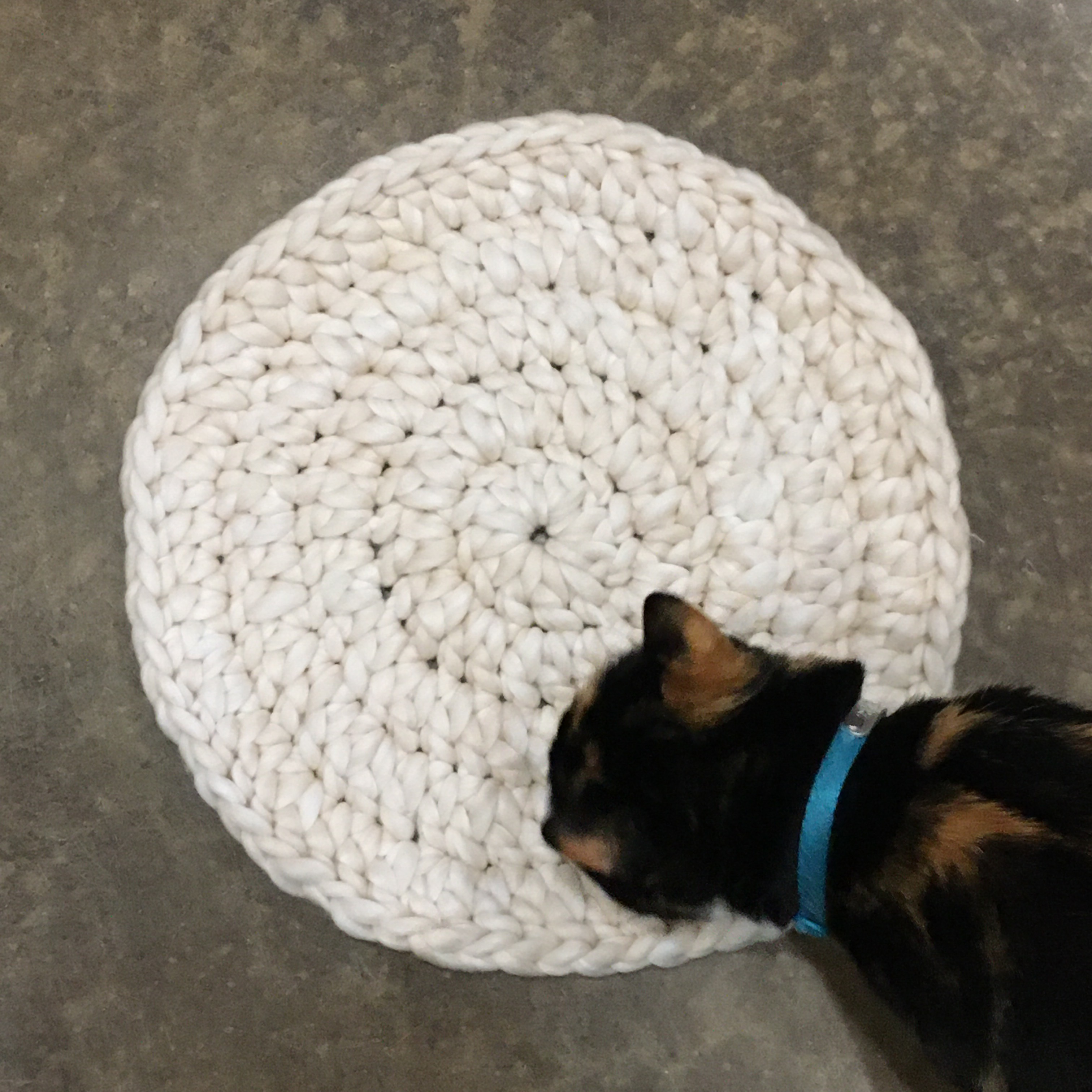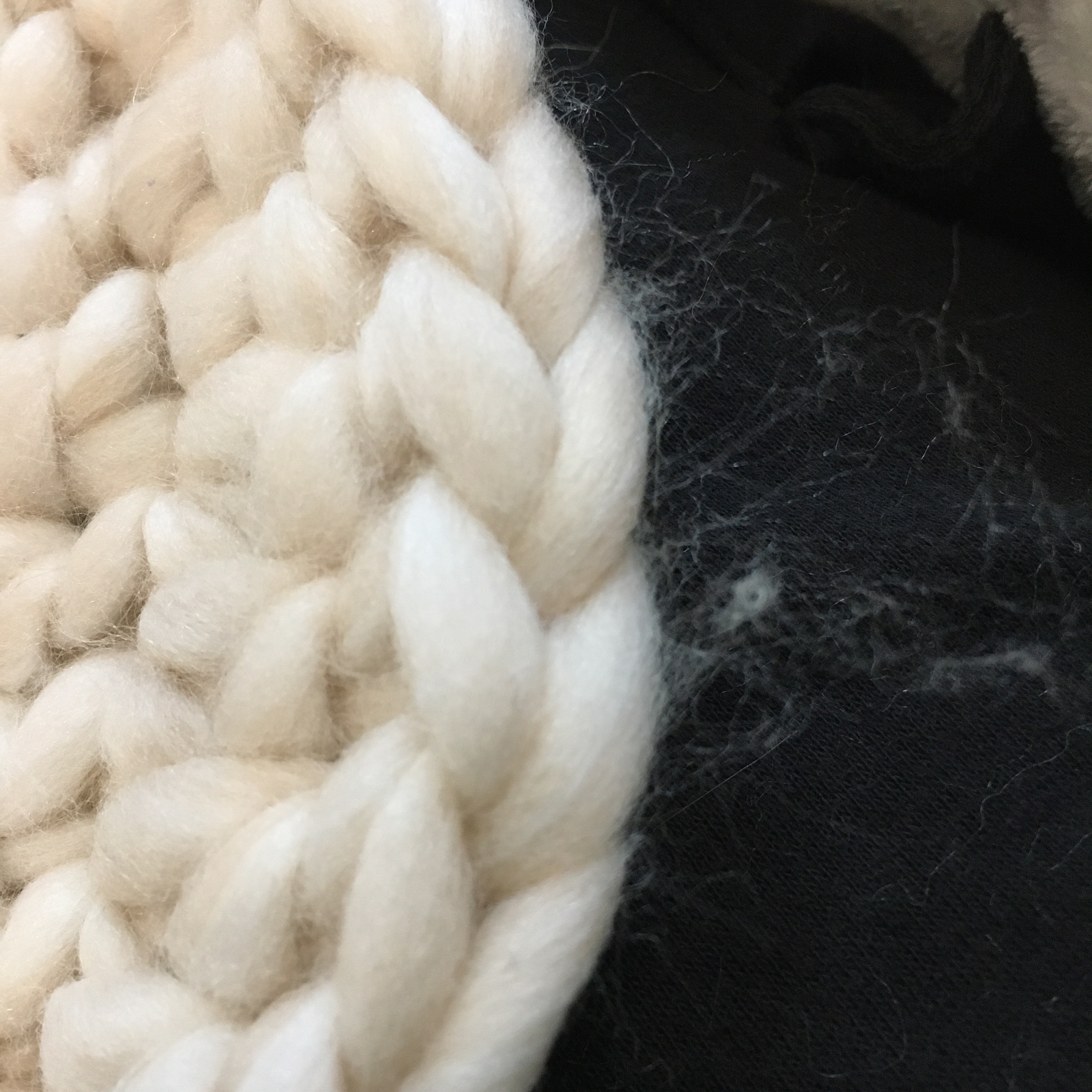 There are many posts and videos about arm knitting using this kind of fiber, the problem is, we spin fiber to make it more resilient and give it strength. Fiber that is only combed has neither quality. So to do a first-hand test, I crocheted up a round mat of the fiber using a P crochet hook.