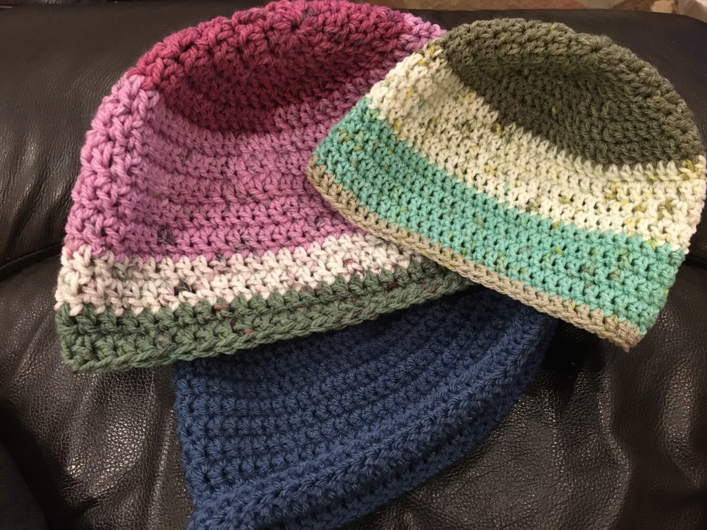 I’m using up all my acrylic yarn by making hats. I like making hats; they are useful and crochet up quick. My go-to pattern is easily adjustable to any hat size. I’ve had it memorized for so long that I don’t remember where I first learned it, and now there are thousands of variations. So here is what I do (American notation):