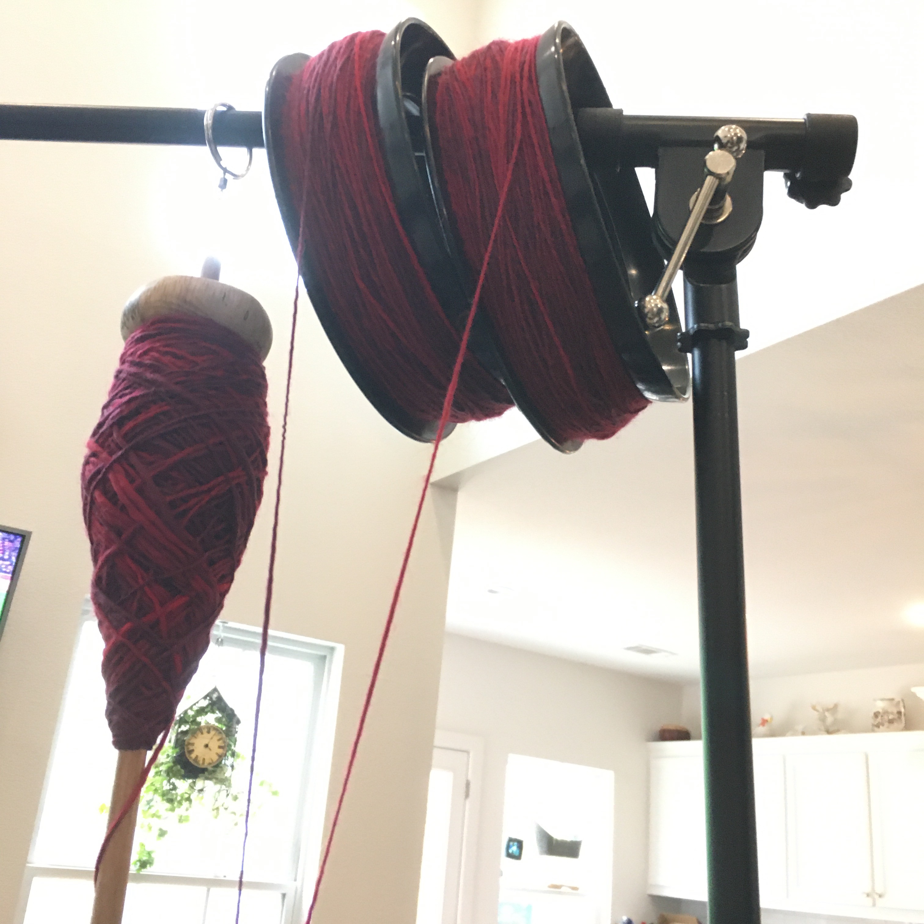 Two spools and a spindle getting ready to ply