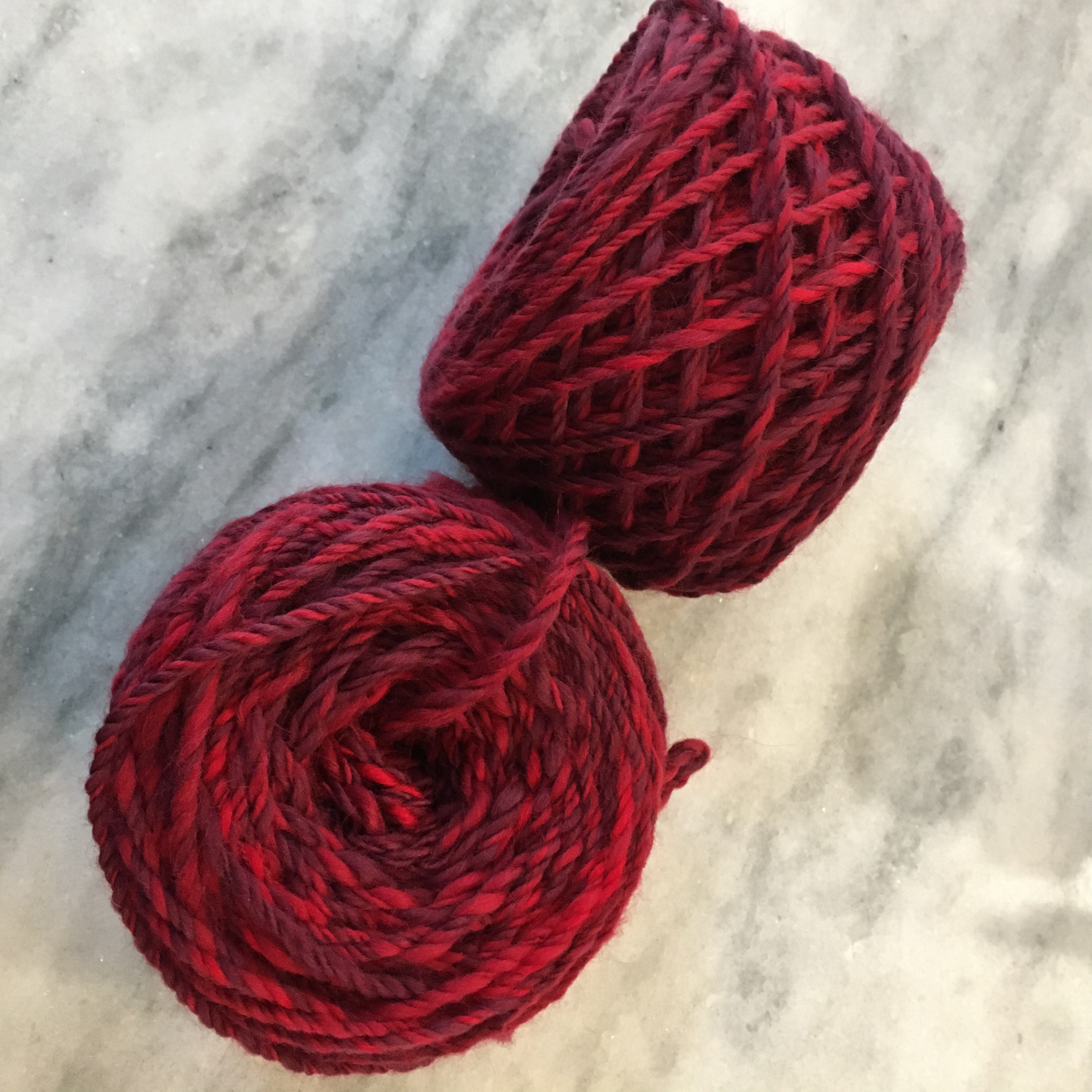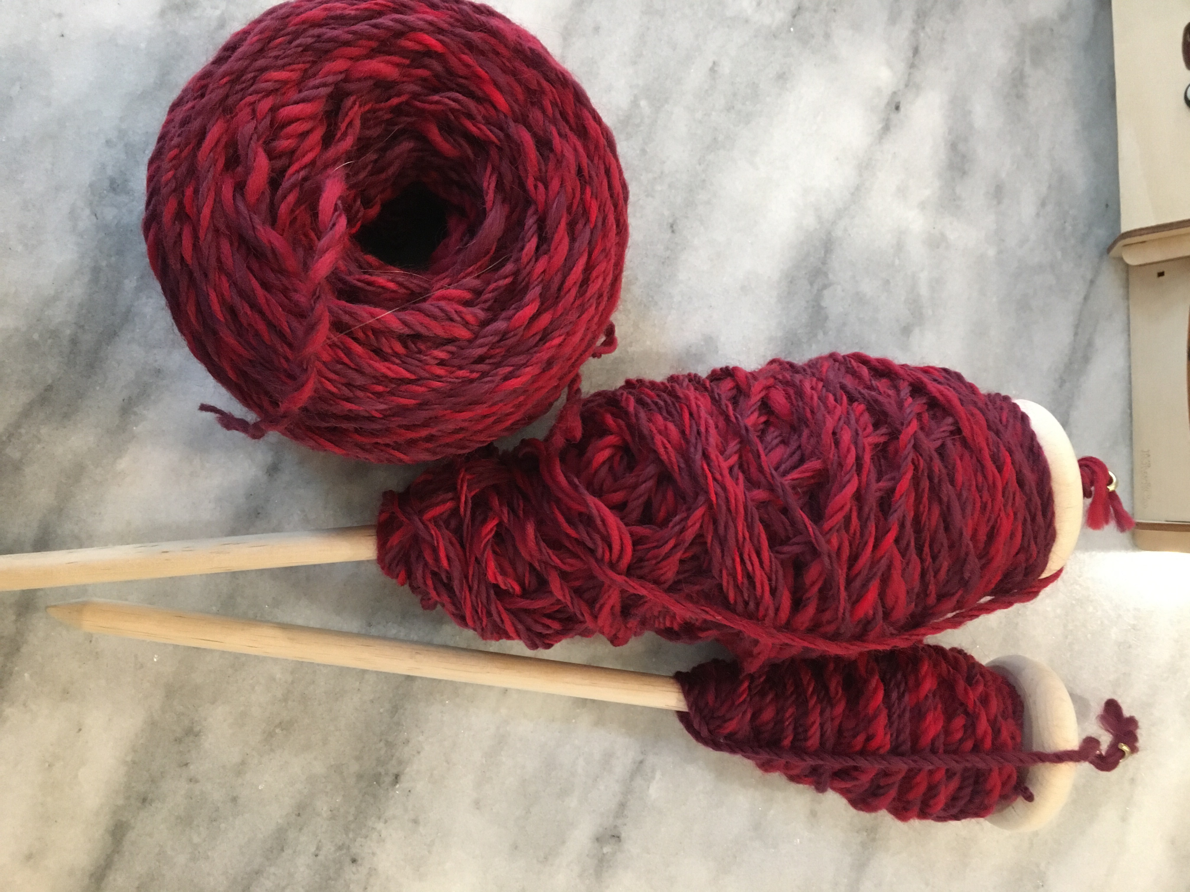 I had enough yarn this time to make two cakes with my wool winder. Yay! Isn’t the color pretty? It is a combination of four shades of red roving.