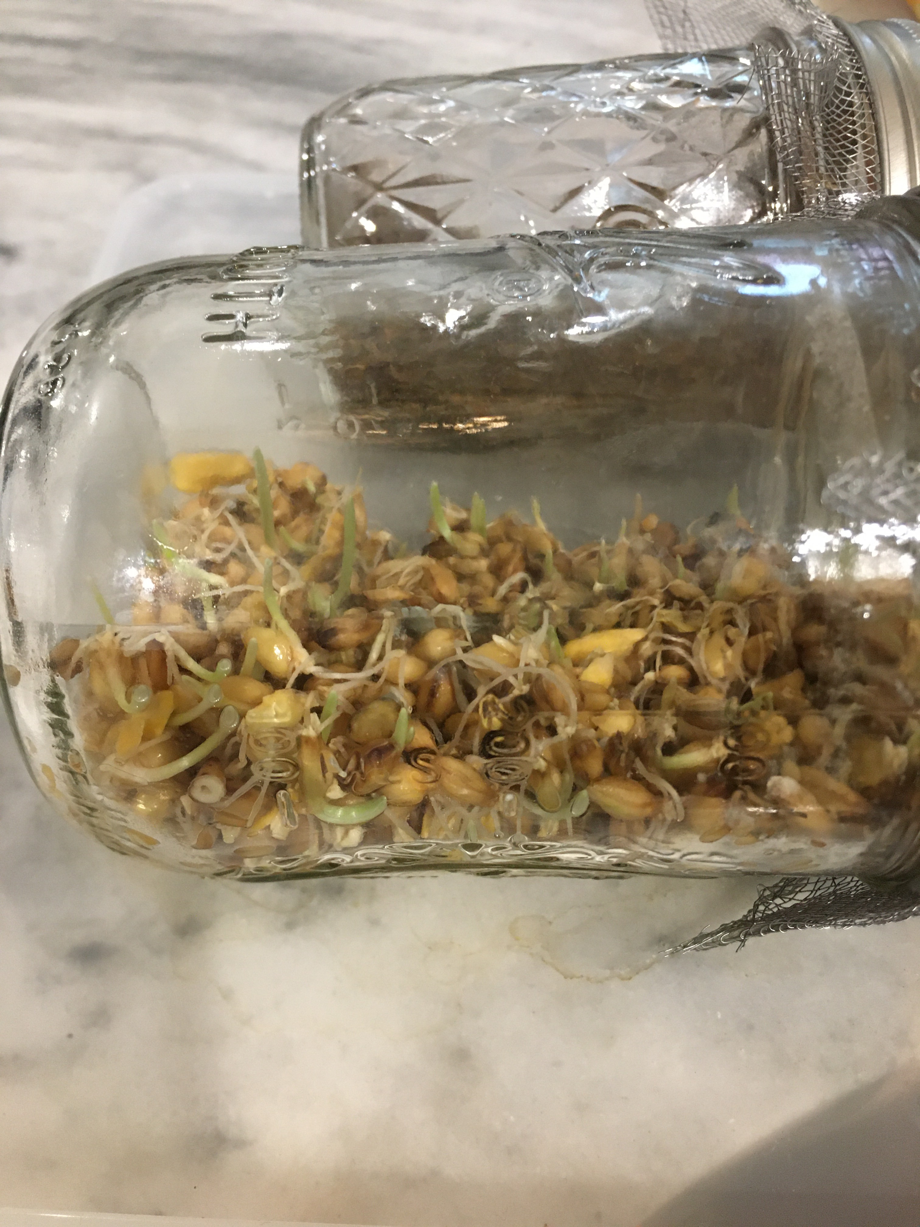 I tried two types of grain: scratch and annual rye (again because that is what I had). I put 3-4 Tablespoons of seed in each jar and covered them with water. I fit a square of window screen to the top of the jar, folded over the edges so they wouldn’t be as pokey, and screwed down the lid. I let the seeds soak overnight, then tipped them over the sink to drain off the water. I rinsed the seeds twice a day and left the jars on their sides in a low tray to drain.