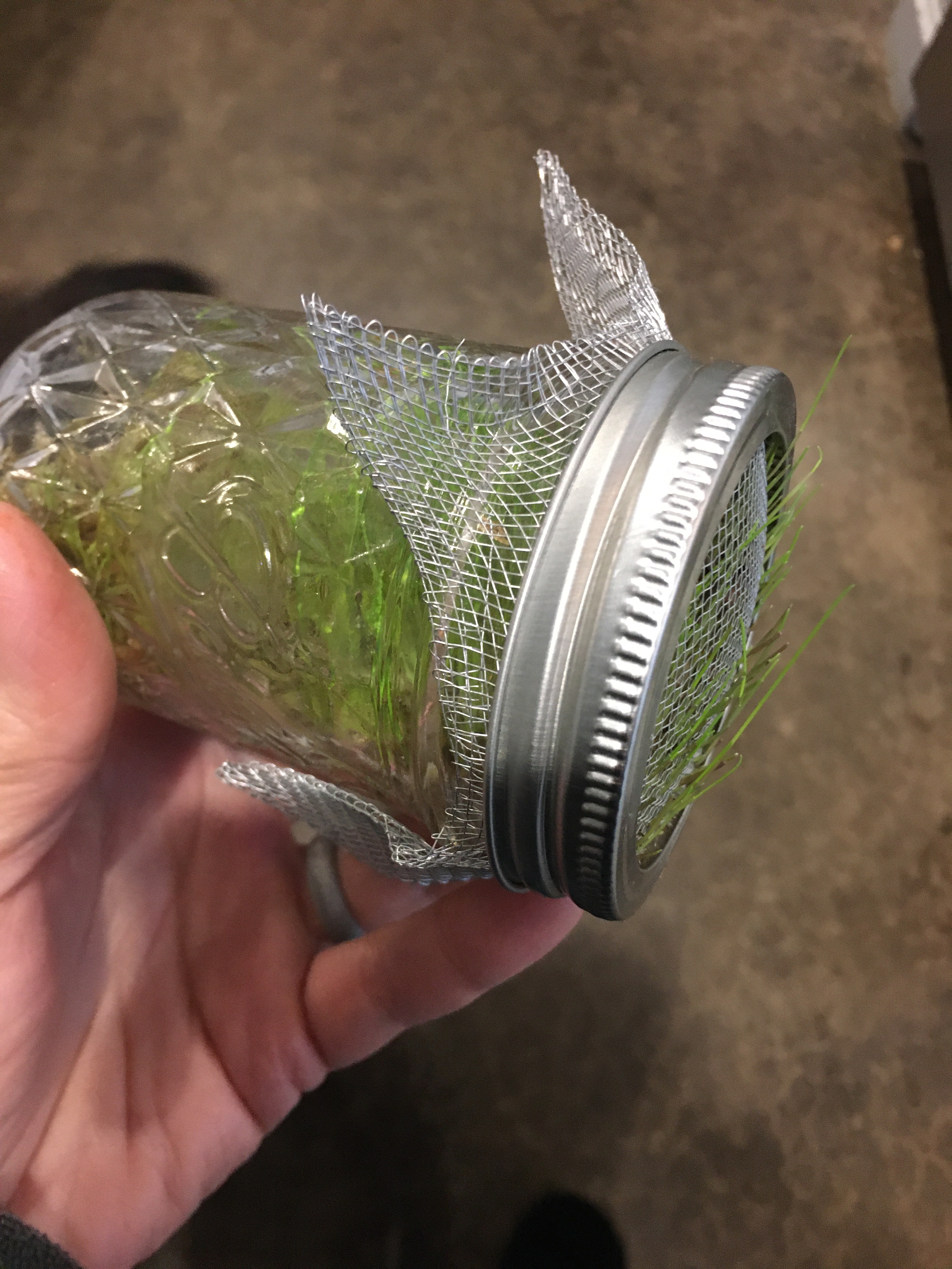 Since it is winter, and the grass is not growing well in the coop, I decided to give sprouting grain inside a try. I found a couple posts on sprouting grain in mason jars, and since I have some empty jars with rings, and some extra aluminum window screen, I’m trying this method first.