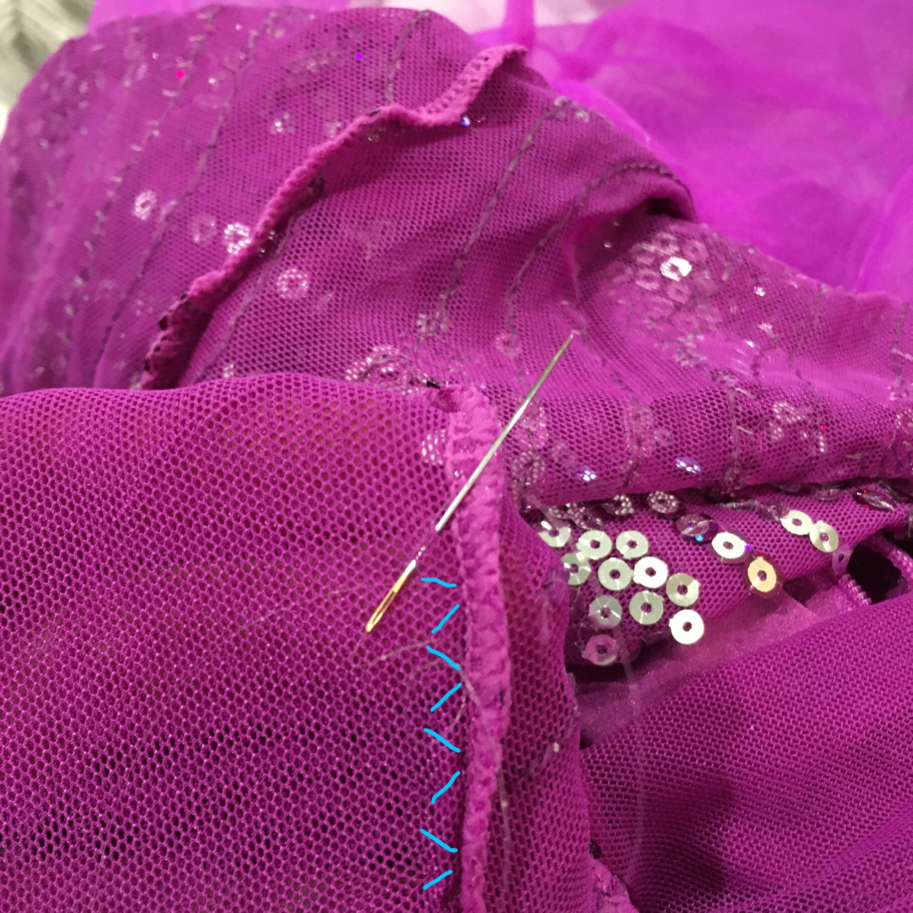 This time, I used a zig zag stitch. Not with my machine, but by hand. The material is a stretchy net, no way was I going at this with my sewing machine especially with a slippery thread. We might need to let down the sleeves at some point, and I wanted to minimize potential damage both with the stitch going in, and eventually coming out. It took a little longer, I had to do the stitches one at a time, but the result is so much stretchier!