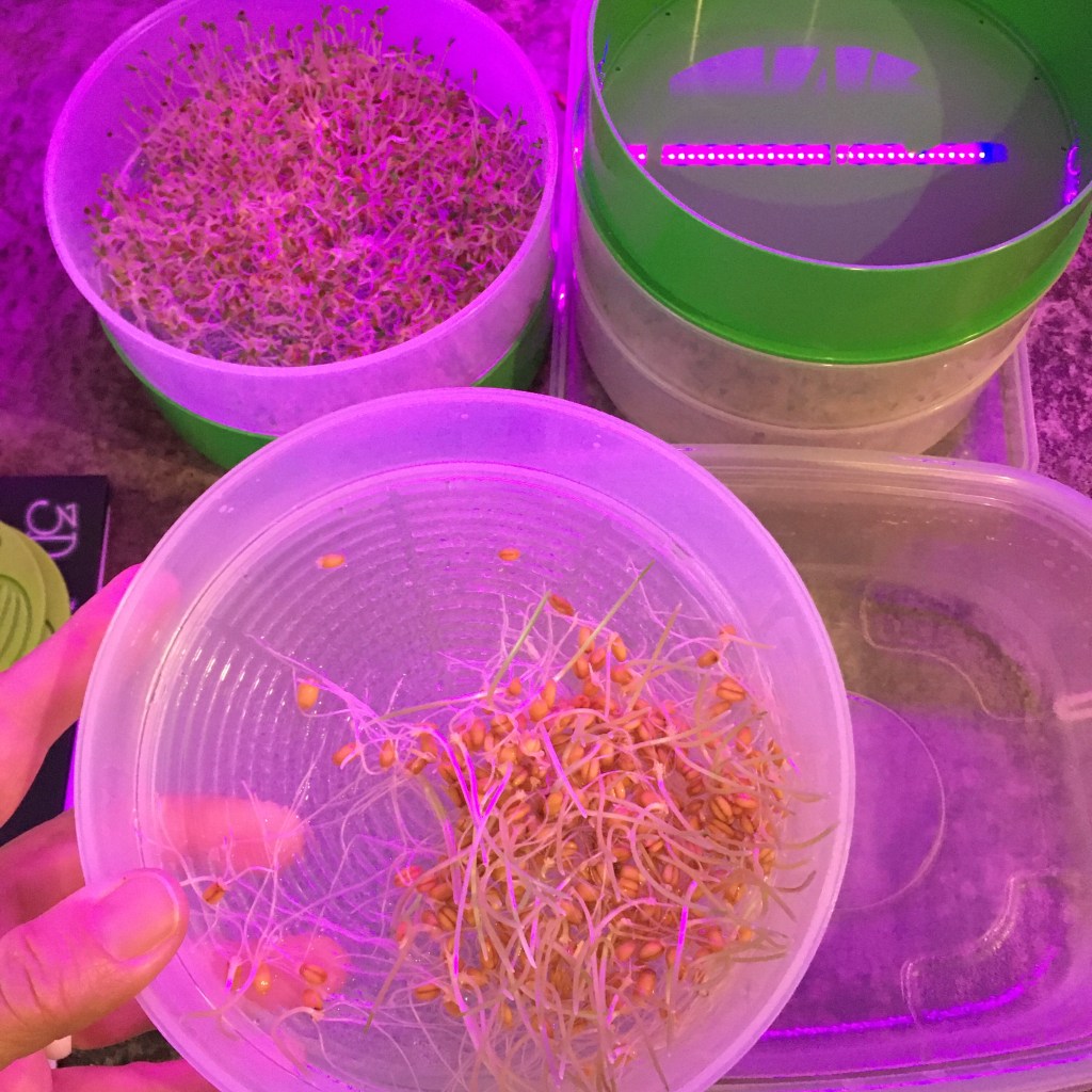 I followed the directions, and put the sprouter by the LED grow lights. After about a week I had sprouts large enough to feed the chickens! I transferred some to a flat container and the chickens loved it.