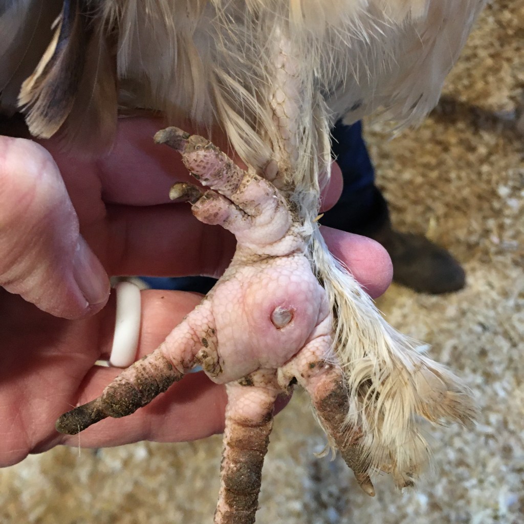 We checked on her foot the next day and the swelling is down and the hole is healing up! We wrapped the foot back up. My understanding is that this is bumble foot. The chicken (or duck) gets something foreign stuck in their foot and it gets infected. This is actually the second foot I’ve picked a mud pack out of. The first one was on Seashell and it was already mostly healed; the mud plug didn’t come out with extra … stuff. Heavier breeds are more prone to this malady since there is a larger impact on their feet when they jump down.
