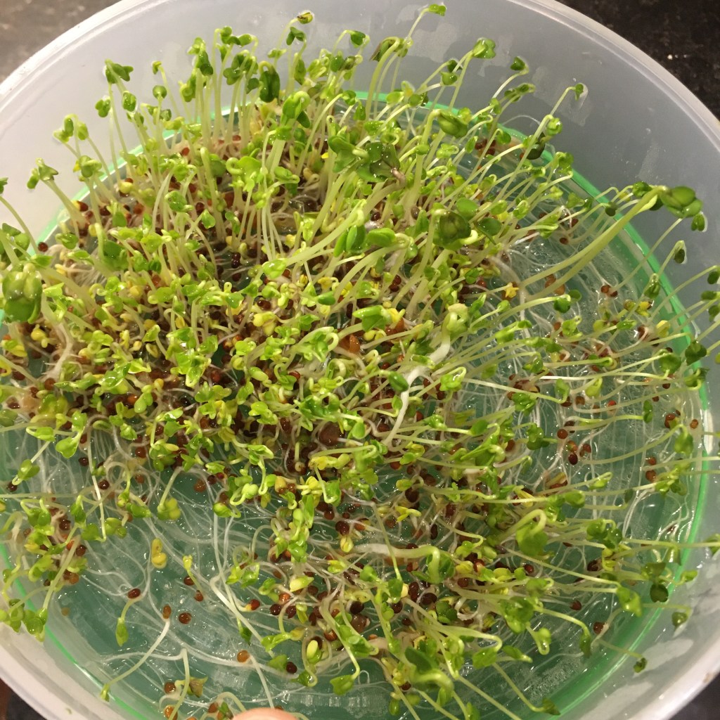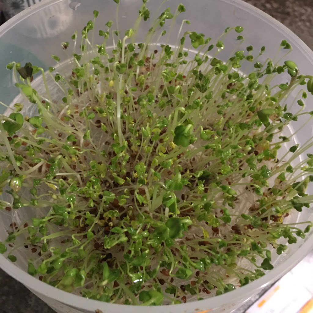 The Spring salad mix took 5 days to sprout. This has some zing! The radish sprouts in the mix pack a punch. The chickens loved them.