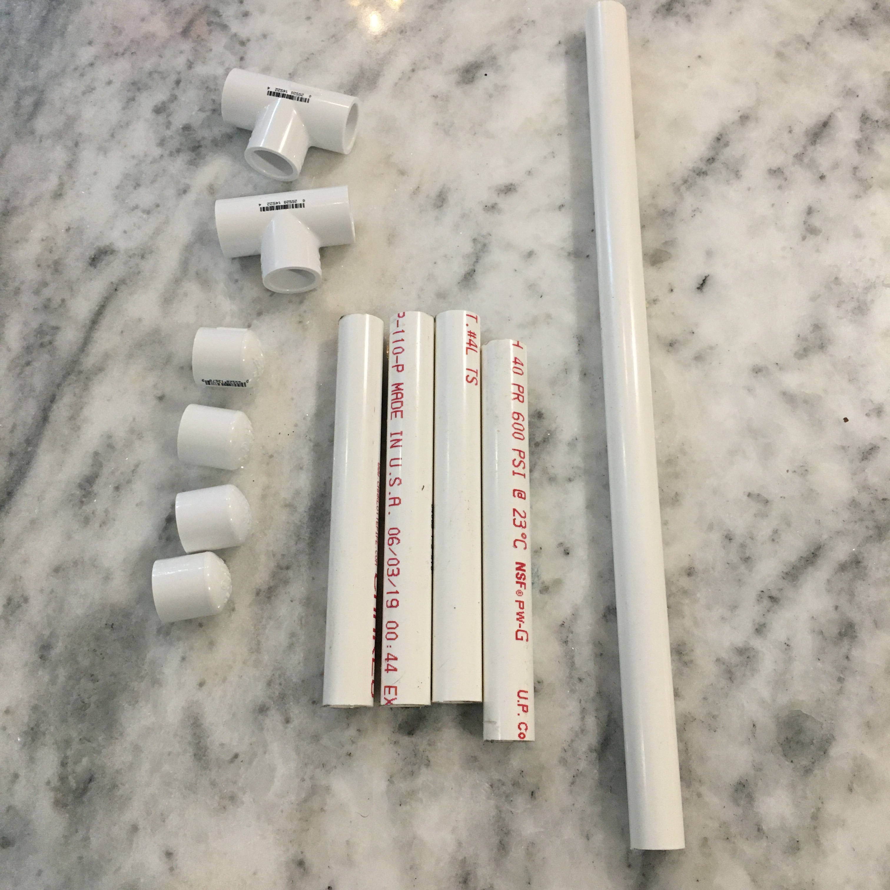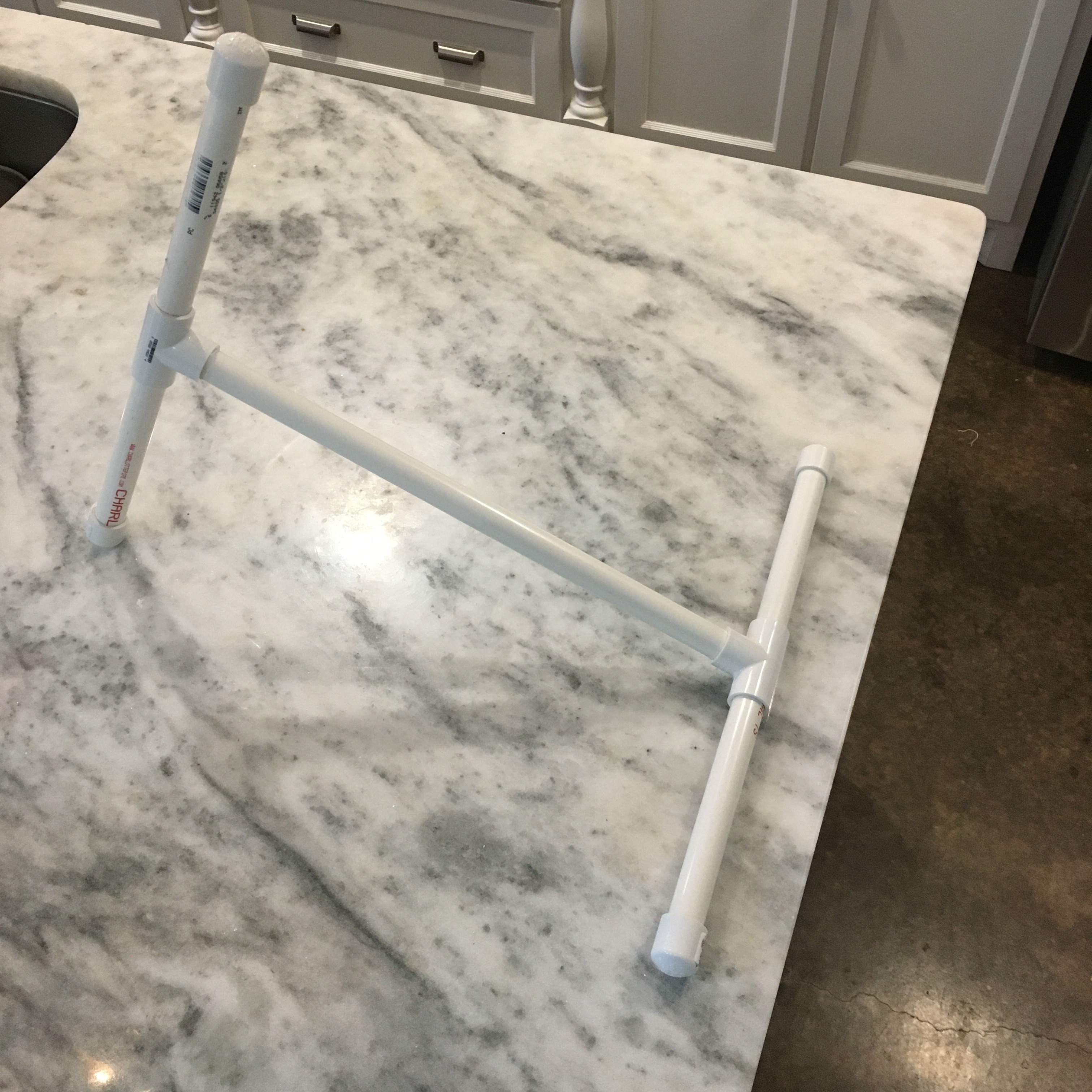 I already had 1/2” PVC pipe, so I went to the hardware store for two tee fittings and four caps. I cut the pipe into lengths of one 16” and four 7” pieces with my band saw. Assembling was easy, and I gave the finished H shape a half twist.