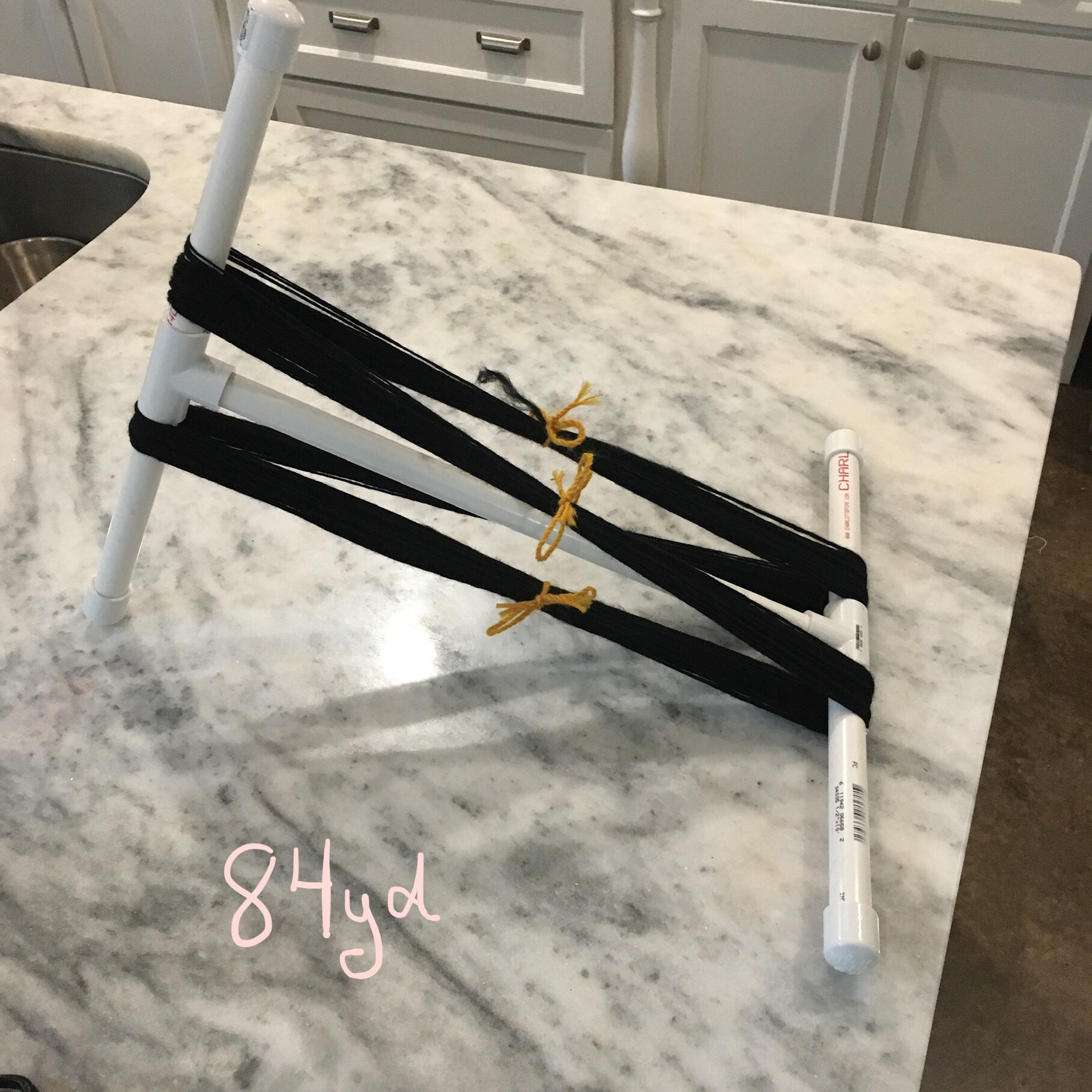 I made the central post 16” so that the resulting height with tee fittings would be 18”, which should make each loop of yarn around 2 yards. So I think I made about 84 yards of yarn. I used some contrasting bits of wool yarn to tie the centers so that when I do take it off the niddy noddy it shouldn’t become a tangled mess. The nice thing about using PVC is that I can rinse the yarn to set the twist with the yarn still under tension on the niddy noddy. We’ll see how the yarn comes out when it is dry!